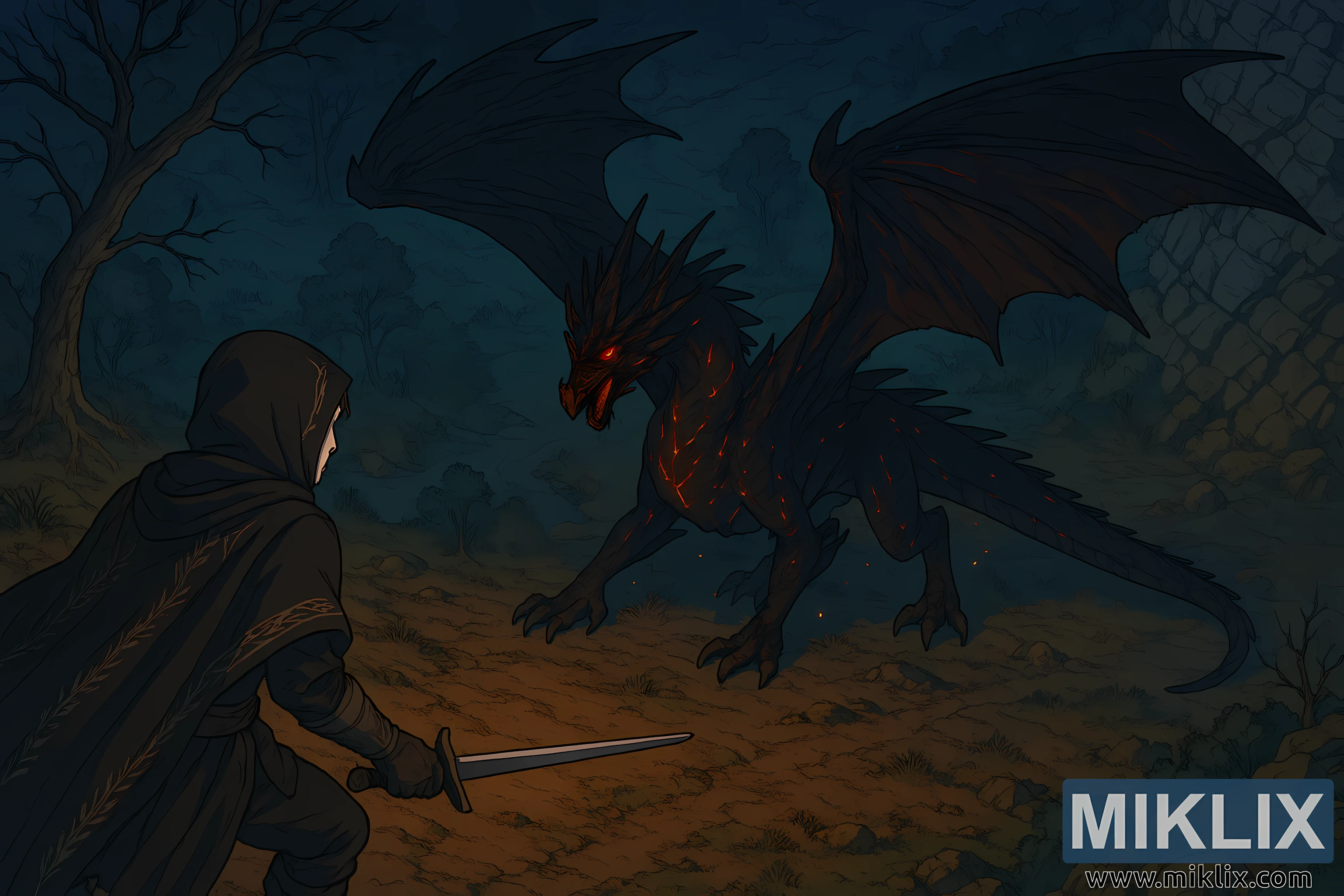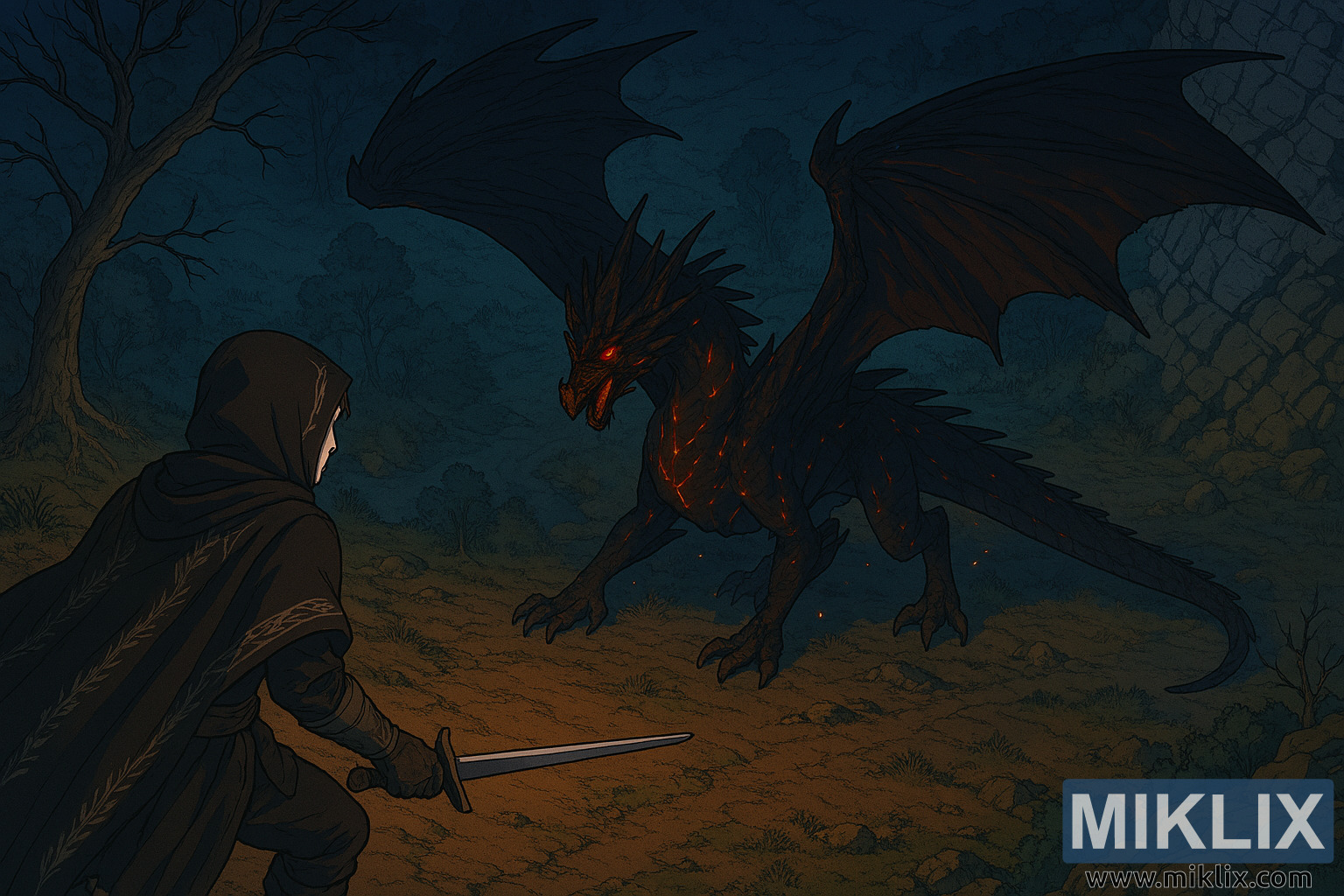 Debesis ir virpuļojošs gobelēns ar dziļi ziliem, violetiem un zilganzaļiem toņiem, kas liecina par maģisku turbulenci un seno spēku. Apgaismojums ir noskaņains un atmosfērisks, pūķa sarkanajam mirdzumam metot siltus akcentus un dziļas ēnas ainavā. Kompozīcija ir diagonāla, un Aptraipītais un Fortissax ir novietoti pretējos stūros, radot dinamisku vizuālo spriedzi.