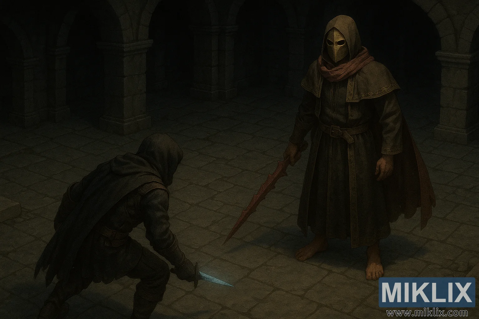 Vide pastiprina drūmo atmosfēru. Fonā stiepjas biezi akmens pīlāri un noapaļotas arkas, kas atkāpjas ēnā un tumsā. Pazemes cietuma grīdu veido lielas, nolietotas akmens flīzes, nelīdzenas un saplaisājušas, ar vecuma un nevērības pēdām. Apgaismojums ir minimāls un dabisks, ar maigiem izcēlumiem un dziļām ēnām, radot smagu, nomācošu noskaņu.
