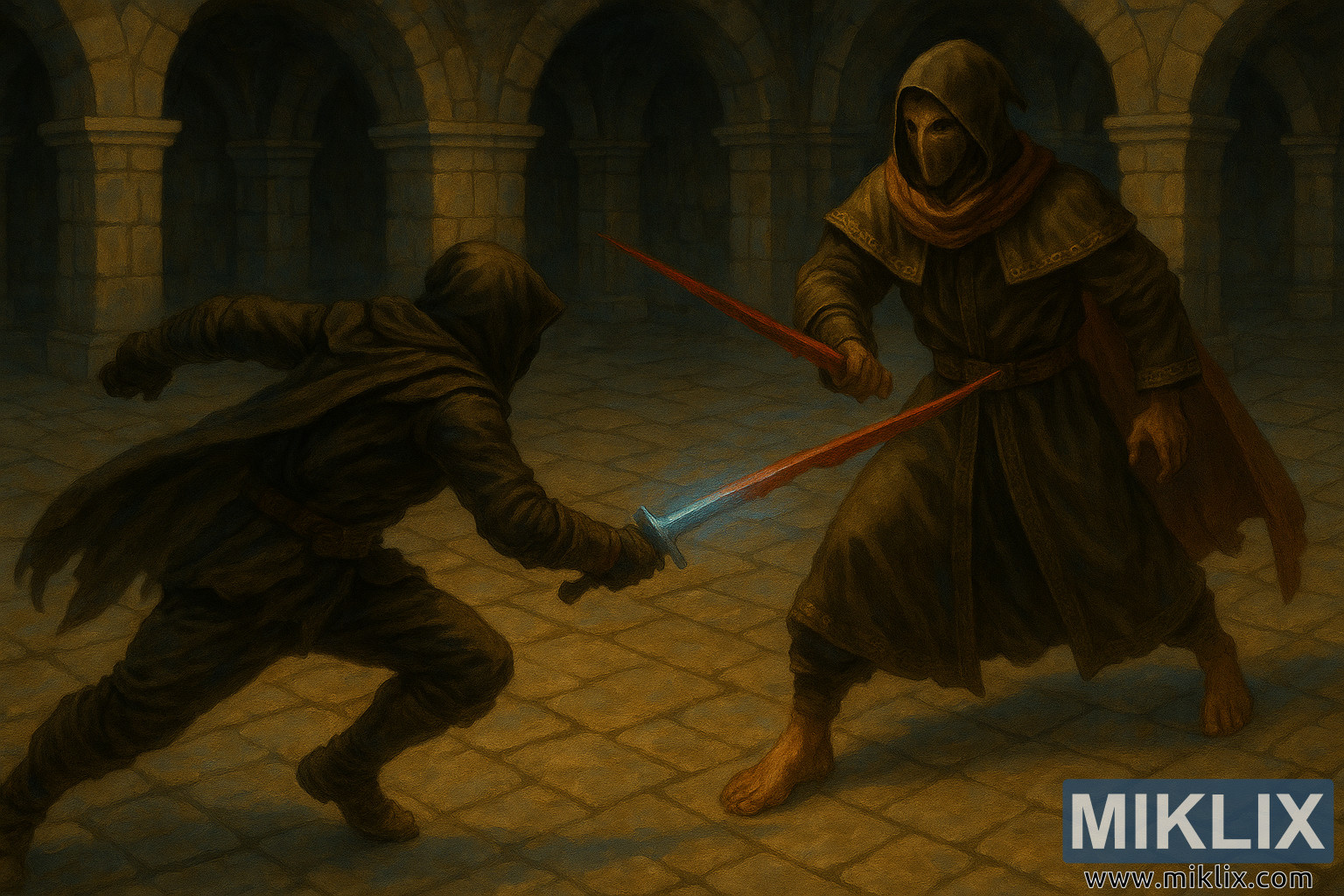 Attēlā attēlots dinamisks tuvcīņas brīdis, kas risinās pazemes cietumā zem senām drupām, un tas ir atveidots reālistiskā tumšās fantāzijas glezniecības stilā ar bagātīgāku, krāsaināku apgaismojumu nekā iepriekšējās versijās. Kompozīcija ir plaša un kinematogrāfiska, ļaujot skaidri redzēt gan cīnītājus, gan vidi, vienlaikus saglabājot dziļuma un kustības sajūtu.