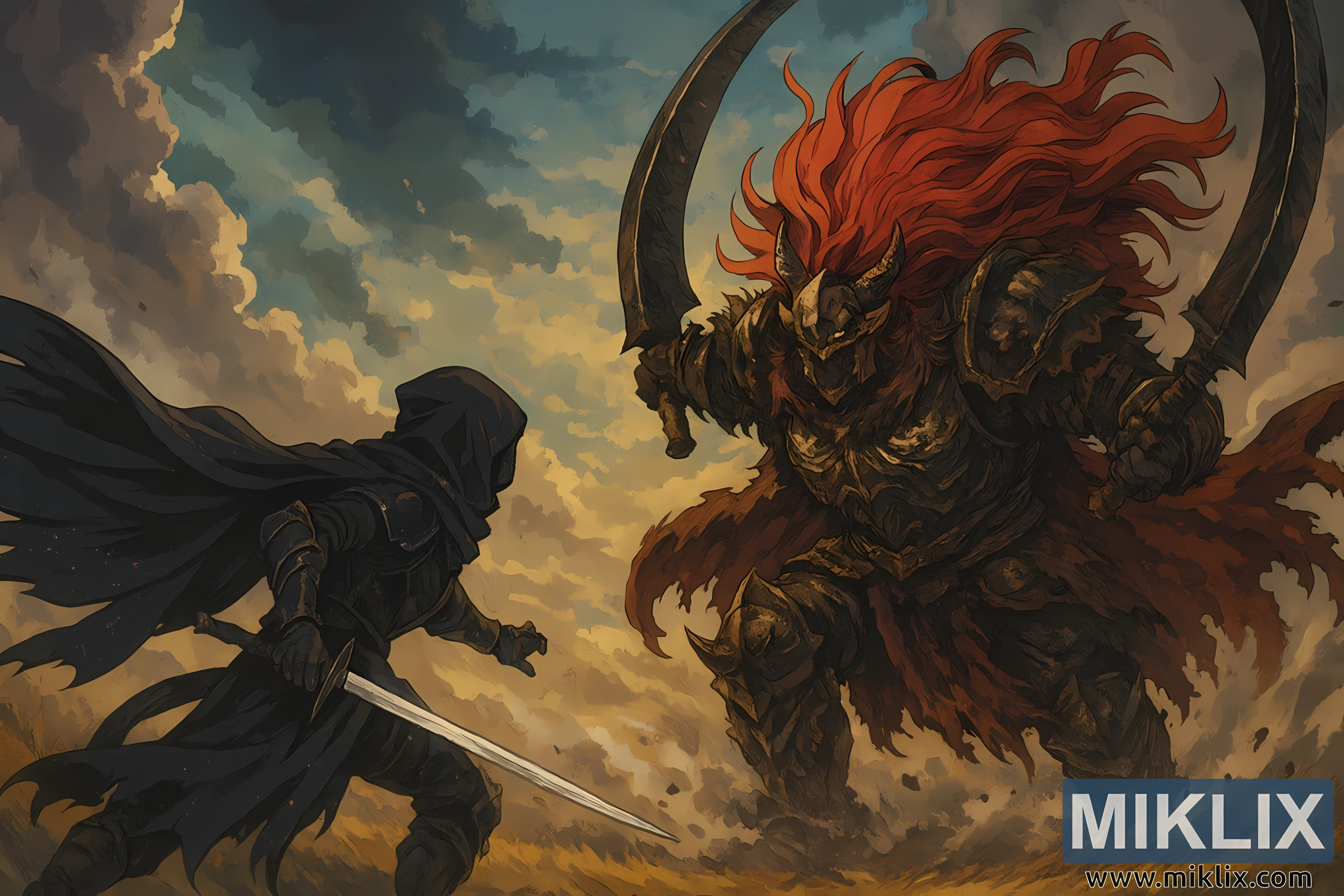Dramatiska anime stila ilustrācija iemūžina intensīvu cīņu starp diviem ikoniskiem Elden Ring varoņiem: Aptraipīto, tērptu Melnā Naža bruņās, un kolosālo pusdievu Starscourge Radahn. Aina risinās vētras plosītā kaujas laukā zem virpuļojošām tumšu mākoņu un zeltainas gaismas debesīm. Radahns, slejoties labajā pusē, ir monstruoza figūra, tērpta robainās, aptraipītās bruņās, kas rotātas ar dzelkšņiem, galvaskausa motīviem un ar kažokādu oderētu nodriskātu audumu. Viņa ķivere atgādina ragota zvēra galvaskausu, un viņa mežonīgās, ugunīgi sarkanās krēpes plūst augšup kā liesmojoša elle. Viņa mirdzošās acis caururbj ķiveres spraugas, kad viņš metas uz priekšu ar diviem masīviem, izliektiem zobeniem, kas pacelti augstu, gatavi uzbrukt.