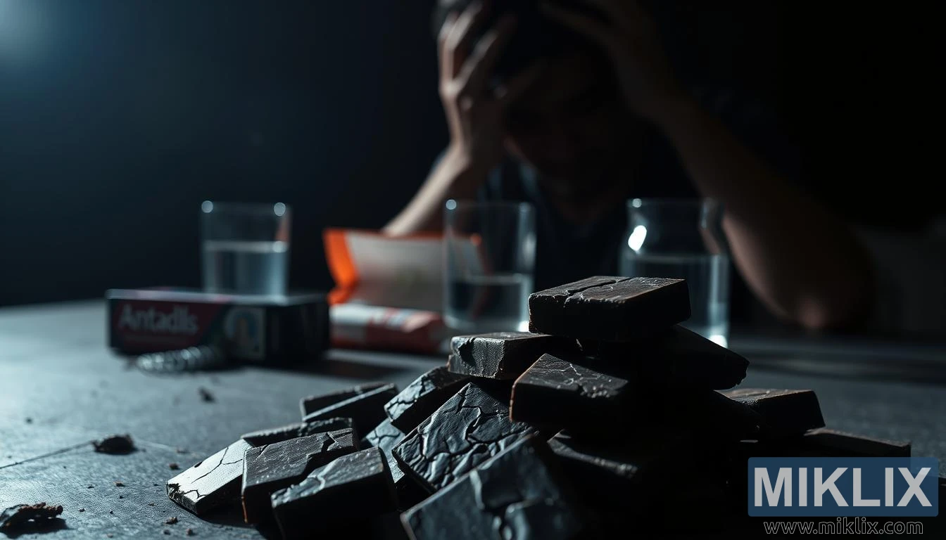 Klusā daba ar saplaisājušu tumšo šokolādi ar antacīdiem līdzekļiem, ūdeni un ēnainu figūru, kas simbolizē ar šokolādi saistītas gremošanas problēmas un galvassāpes.