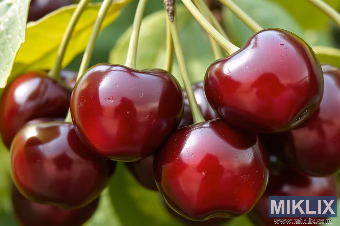 Во овој буен и интимен крупн план, грозд зрели цреши грациозно виси од тенка гранка на дрво, а секој плод е сјаен доказ за богатството на средината на летото. Црешите се темноцрвени, некои се граничат со бордо, нивните лушпи се затегнати и сјајни со природен сјај што ја рефлектира амбиенталната светлина. Нивните форми во облик на срце додаваат допир на елеганција и шарм, правејќи ги да изгледаат не само вкусни, туку и визуелно поетски. Мали капки вода се лепат за нивните површини, фаќајќи ја светлината како минијатурни скапоцени камења и зголемувајќи го чувството на свежина и виталност. Без разлика дали станува збор за неодамнешен дожд или утринска роса, овие капки ѝ даваат на сцената чувство на непосредност, како гледачот штотуку да стапнал во овоштарникот моменти по нежниот допир на природата.