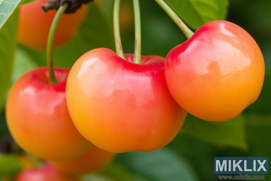 Во овој сјаен крупн план, грозд од цреши од сортата Рејниер нежно виси од гранка на дрво, а нивните светлечки лушпи светат со топлината на летото. Секоја цреша е мало ремек-дело од боја и форма, прикажувајќи го препознатливиот градиент што ја издвојува оваа сорта од нејзините потемно црвени роднини. Почнувајќи од златно-жолтата основа, црешите преминуваат нагоре во мека руменило од розово-црвена боја, како да се бакнати од сонцето. Овој природен омбре ефект не е само визуелно фасцинантен, туку е и јасен показател за нивната зрелост и сладост, поканувајќи го гледачот да го замисли напливот на вкус што лежи веднаш под површината.