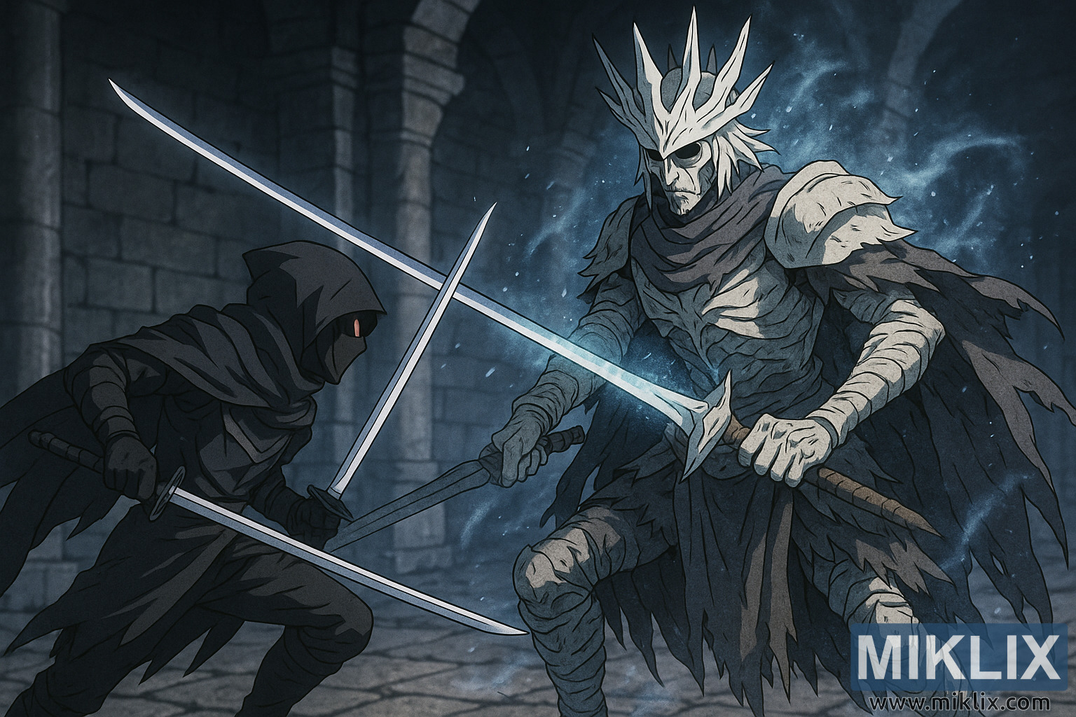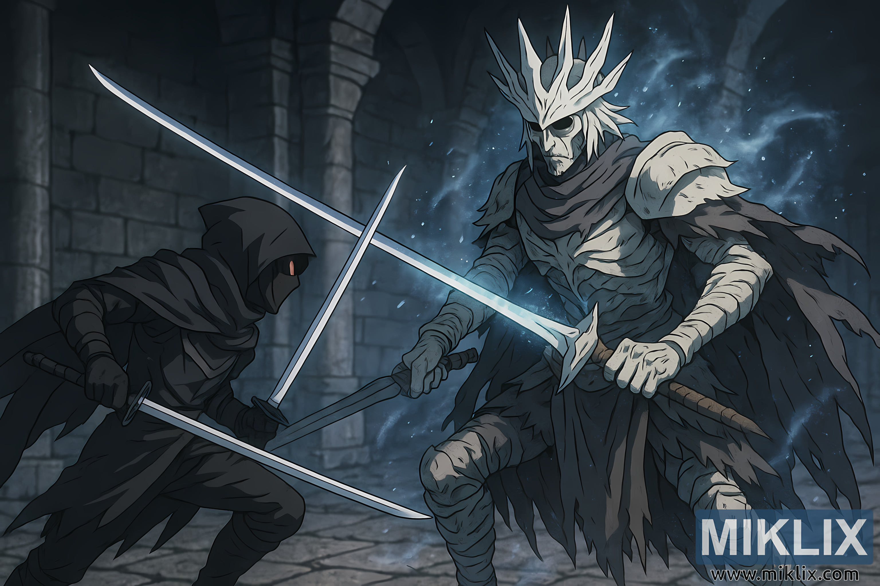 Лево стои ликот на играчот, оклопен во иконскиот сет Црн нож: елегантен, слоевит ансамбл од мат црна ткаенина и кожа дизајниран за тишина, агилност и смртоносна прецизност. Качулката се спушта напред, криејќи го поголемиот дел од лицето освен сјајното црвено око кое ја пробива темнината со чувство на фокус и решителност. Остриот слоевит дизајн на оклопот ја подобрува силуетата, нагласувајќи ја брзината и естетиката на духовен убиец. Играчот ракува со две долги сечила во стилот на катана, секое тесно, полирано и малку закривено. Нивните ставови - едното сечило подигнато дефанзивно, другото држено ниско - сугерираат агилна техника со двојно ракување подготвена за пресретнување или контранапад. Суптилните линии на движење имплицираат брза работа со нозете, а убиецот се наведнува напред во средината на нападот.