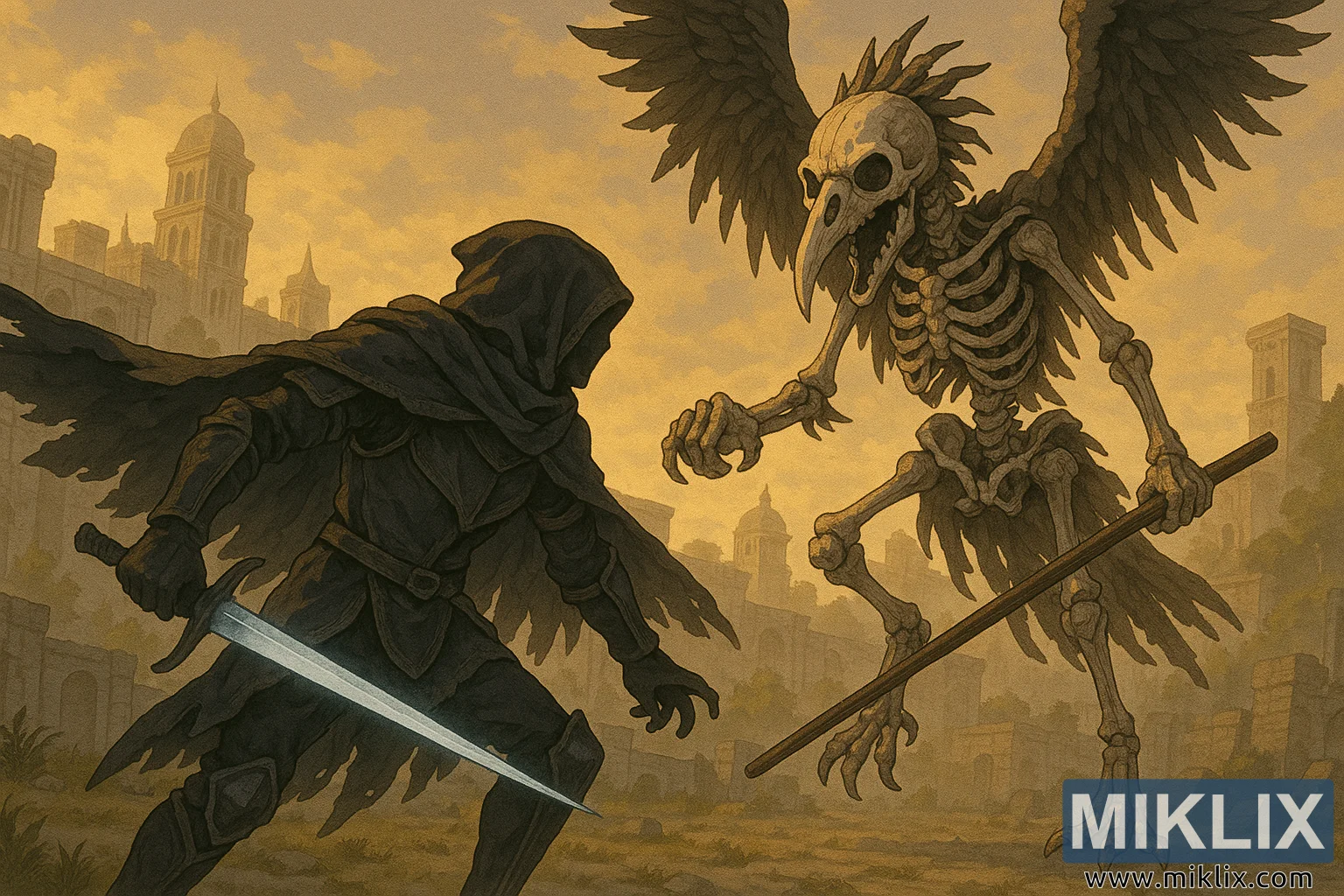 Уметничко дело во аниме стил на оклоп Оцрнет во црн нож кој се бори со скелетна Смртна птица во Престолнинските периферии на Елден Ринг, сместено во златни урнатини.