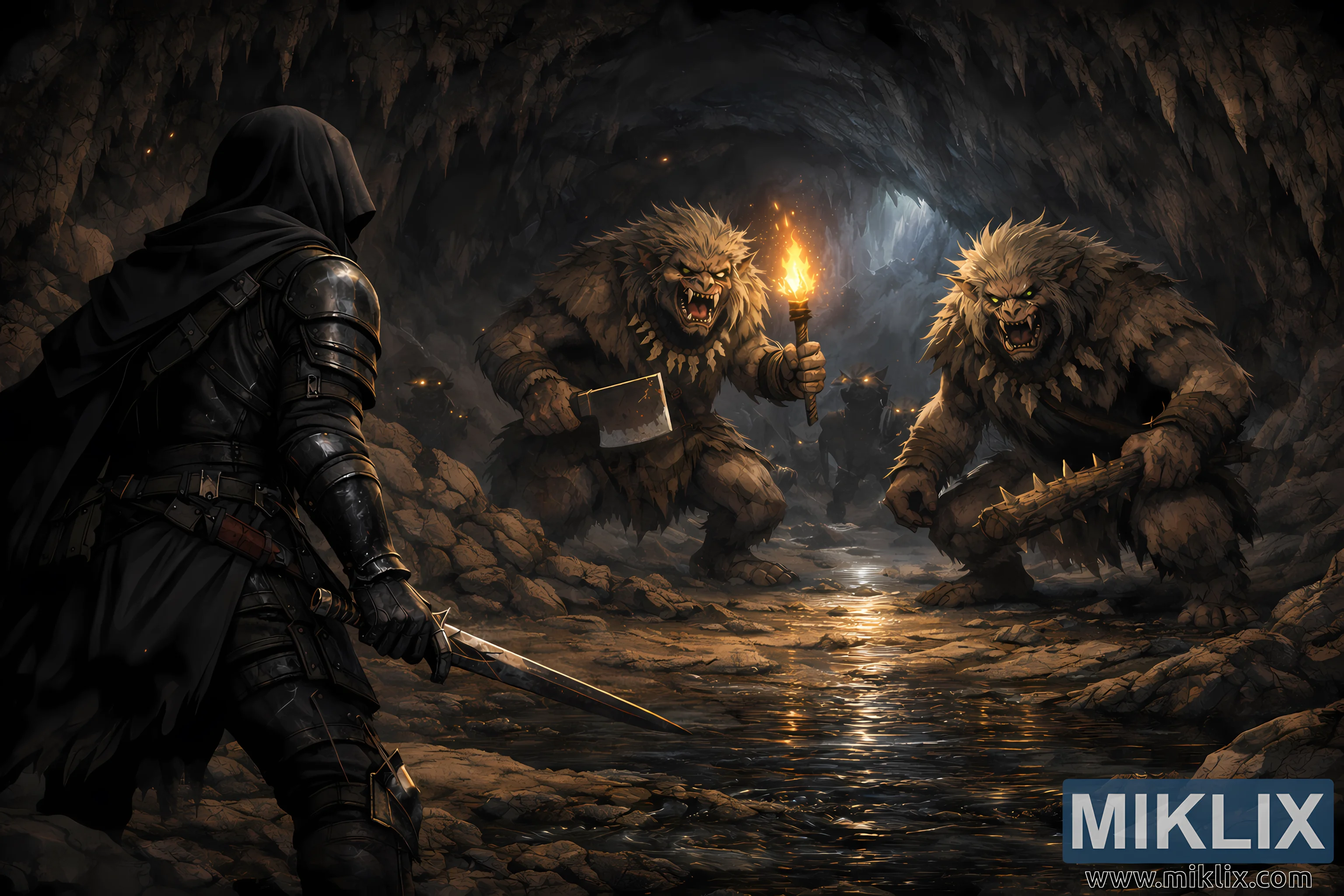 Кинематографско реалистично уметничко дело во темна фантазија кое го прикажува Затемнетиот како се соочува со двајца получовечки поглавари во огромна пештера, со драматично осветлување, детални текстури и напната атмосфера пред борбата.