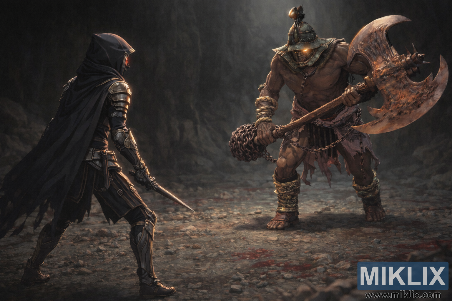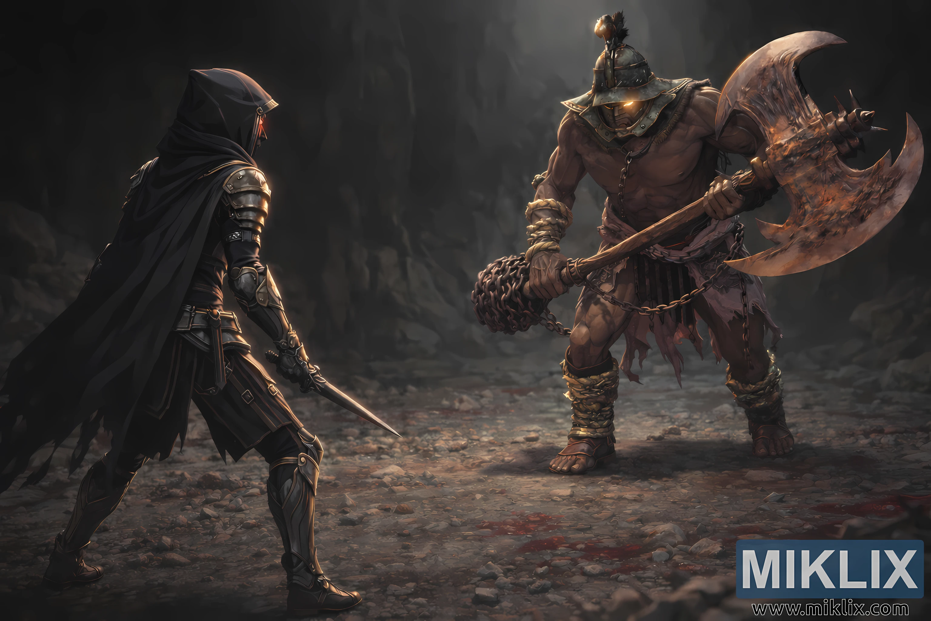 Наспроти нив стои Избезумениот Дуелист, масивен, лузен воин чие гол торзо е испресечено со вени и стари рани. Дебели синџири се намотуваат околу нивниот струк и зглобови, малку тропајќи додека се движат. Тие ракуваат со брутална, преголема секира чие скршено, 'рѓосано сечило се извиткува нанадвор како сурова полумесечина. Шлемот на Дуелистот е излитена и тешка, неговите тесни отвори за очи бледо светат со морничава, златна светлина што ја пробива мракот. Нивниот став е широк и доминантен, со една нога што се гребе во подот расфрлан со чакал додека се подготвуваат за претстојниот судир.