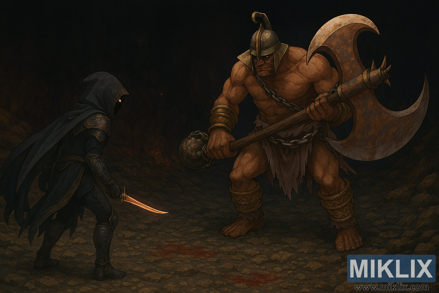 Богато детална дигитална слика во аниме стил доловува напнат момент во Гаол Кејв од Елден Ринг, непосредно пред да избувне борбата помеѓу двајца страшни воини. Сцената е сместена во пештерска, карпеста средина со назабен терен под нозете и крвави дамки расфрлани по земјата. Позадината е составена од темни, груби камени ѕидови обоени во длабоки црвени и кафеави нијанси, додека блескави жарчиња лебдат низ воздухот, додавајќи чувство на злокобно претчувство и топлина во атмосферата.