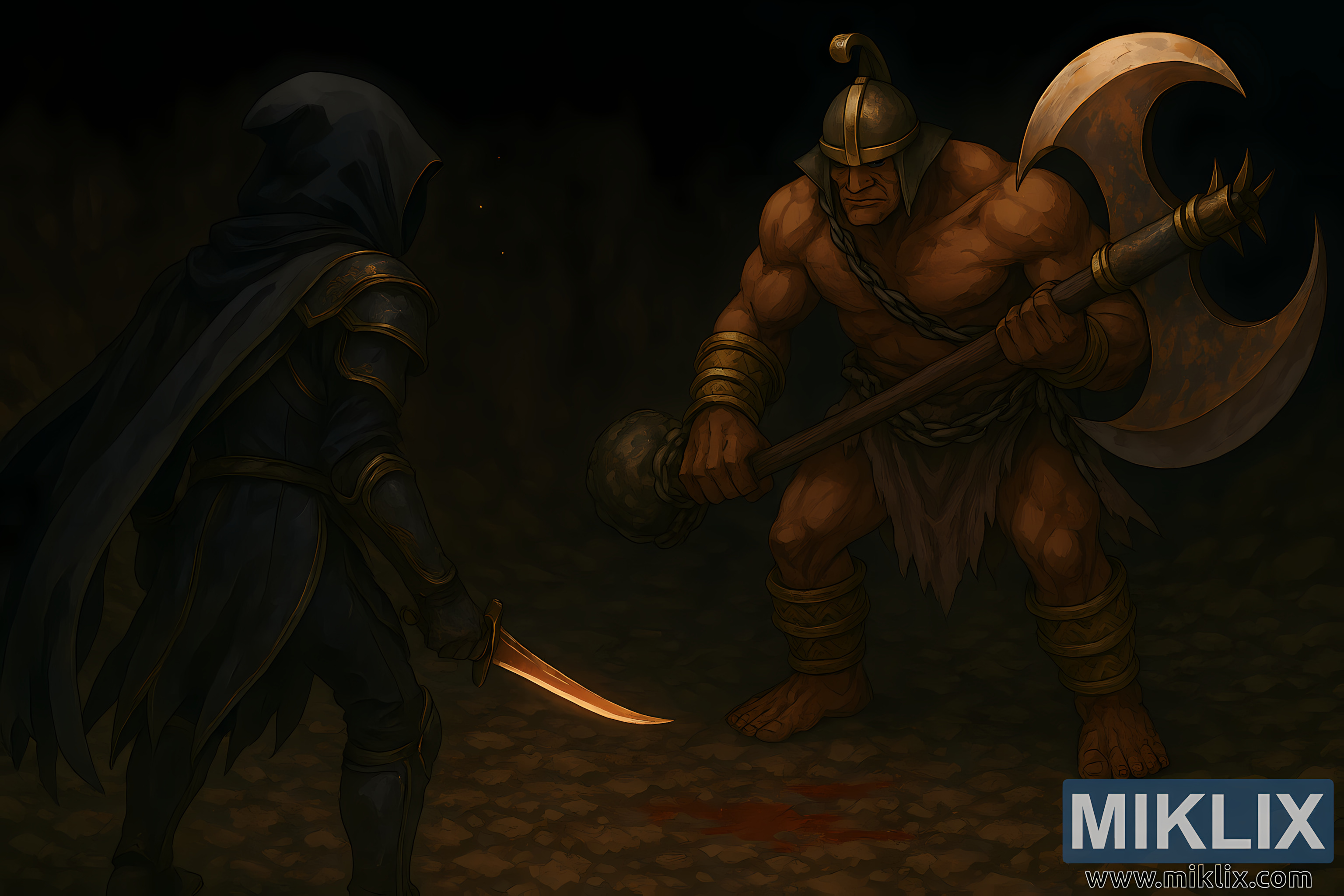 Наспроти него стои Избезумениот Дуелист, импозантен ѕвер со сурови мускули и закана. Неговата кожа е кожеста и штавена, растегната преку испакнати мускули. Носи метален шлем со зашилен грб и тесни процепи на очите, што му дава безличен, застрашувачки изглед. Дебел синџир му се обвиткува околу торзото и десниот зглоб, а од левата рака виси шилеста железна топка. Половината му е покриена со искината бела прекривка за слабини, а дебели златни ленти му ги опкружуваат нозете и рацете, прицврстени со дополнителни синџири. Неговите боси нозе се цврсто засадени на карпестата земја, а во десната рака држи масивна двоглава борбена секира со 'рѓосано, изветвено сечило. Долгата дрвена рачка на секирата е завиткана во синџир, нагласувајќи ја бруталната сила потребна за нејзино ракување.