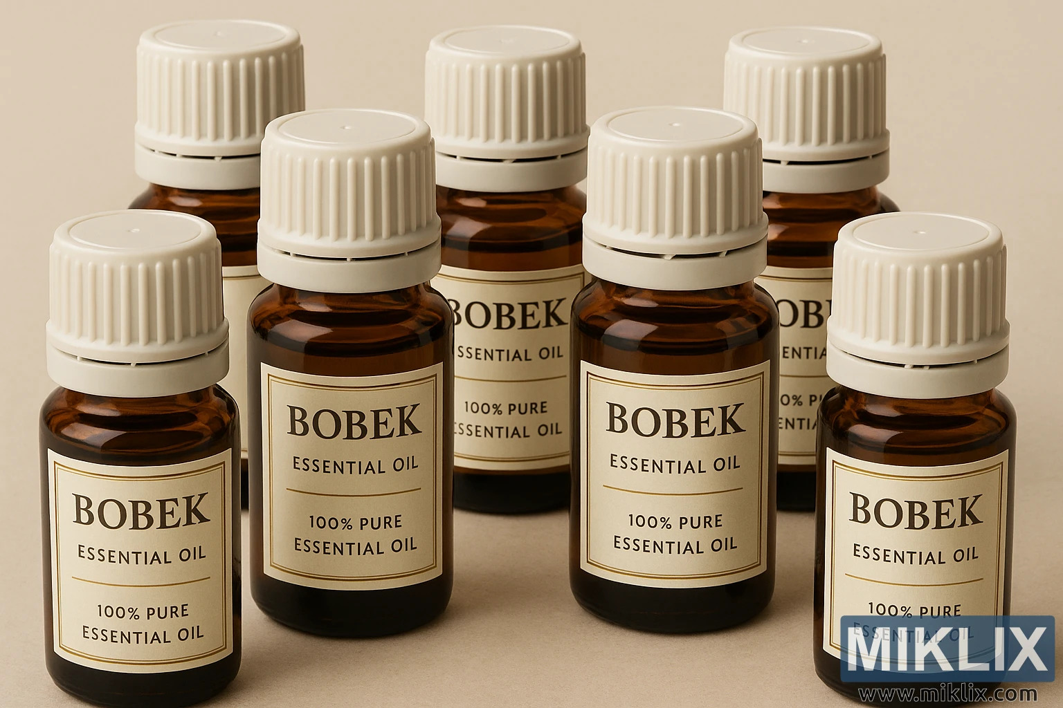 Етикетите, дизајнирани во минималистички и рафиниран стил, го содржат името на брендот „BOBEK“ со задебелен сериф фонт центриран на врвот, проследено со едноставна декларација: „ЕСЕНЦИЈАЛНО МАСЛО“ и „100% ЧИСТО ЕСЕНЦИЈАЛНО МАСЛО“. Текстот е отпечатен со суптилно темно кафеаво мастило на кремаста позадина врамена со фина златна рамка. Овој избор на боја и типографија евоцира луксуз и воздржаност - белези на премиум производ. Етикетите изгледаат совршено порамнети, што укажува на намерен фокус на симетрија и професионална презентација. Секое капаче е во бледа нијанса на слонова коска со фино ребреста текстура, давајќи тактилно чувство на прецизност и квалитетно производство. Доследната форма и боја на капачињата ги балансираат топлите тонови на килибарните шишиња подолу, надополнувајќи ја елегантната визуелна хармонија.