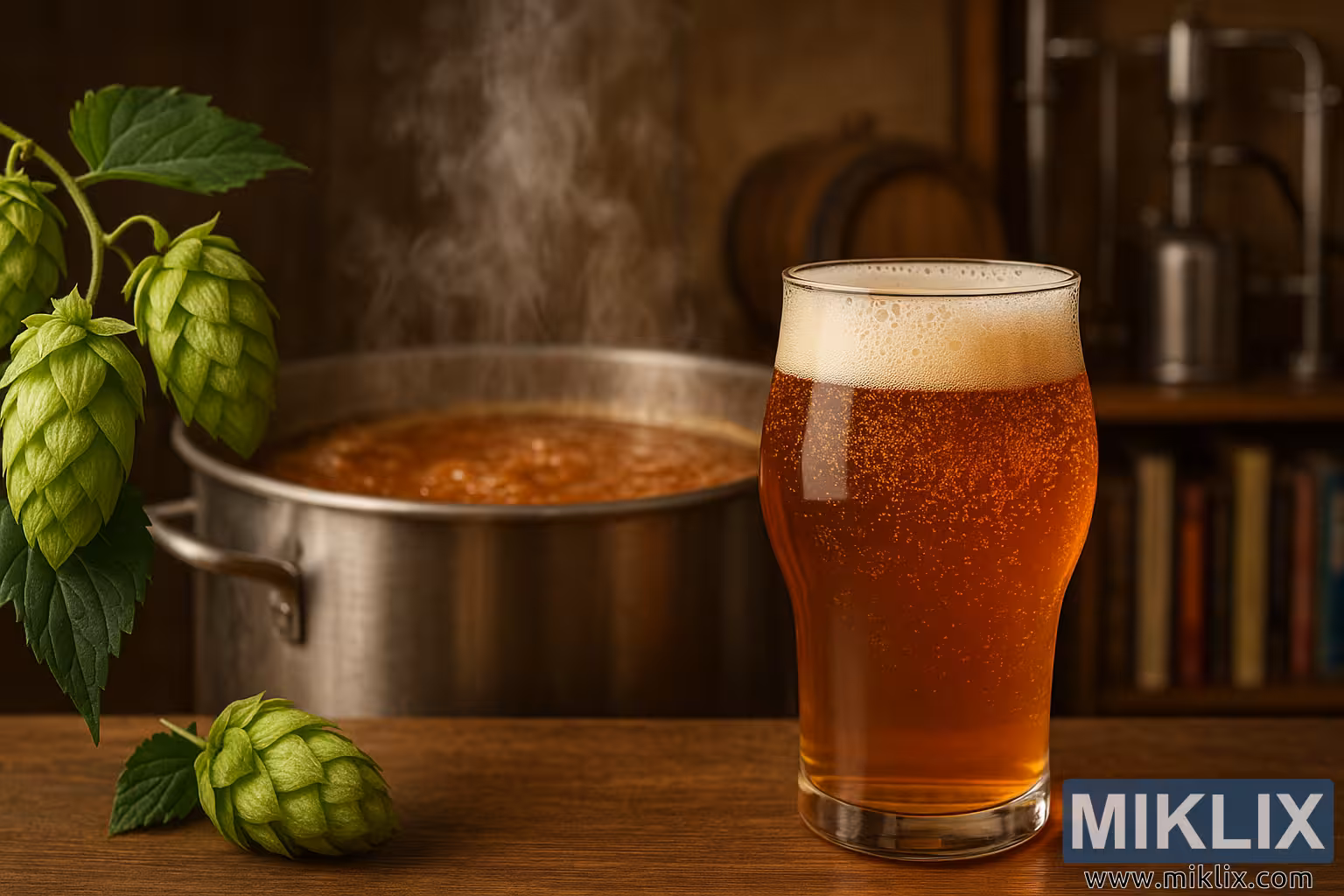 Ќилибарно пиво со хмељ од Каскада покрај парен котел и домашен систем за производство на пиво, нагласувајќи ја аромата на цитрус и занаетчискиот занает на производство со хмељ.