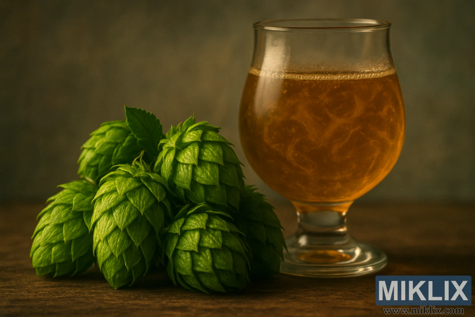 Веднаш зад хмељот стои стаклен сад, најверојатно заоблена чаша во форма на лале, делумно исполнета со златно-килибарна течност. Во течноста се видливи суптилни вртложни струи, што укажува на инфузија на есенцијални масла од хмељ или нежно вознемирување што ја евоцира живата суштина на сувото хмељење. Движењето во чашата додава елемент на динамика на инаку спокојната композиција, симболизирајќи ја активната трансформација што хмељот ја дава на пивото. Килибарните тонови на течноста се хармонизираат прекрасно со зелената боја на хмељот, создавајќи палета од земјени, но живи бои кои зборуваат и за природата и за занаетот.