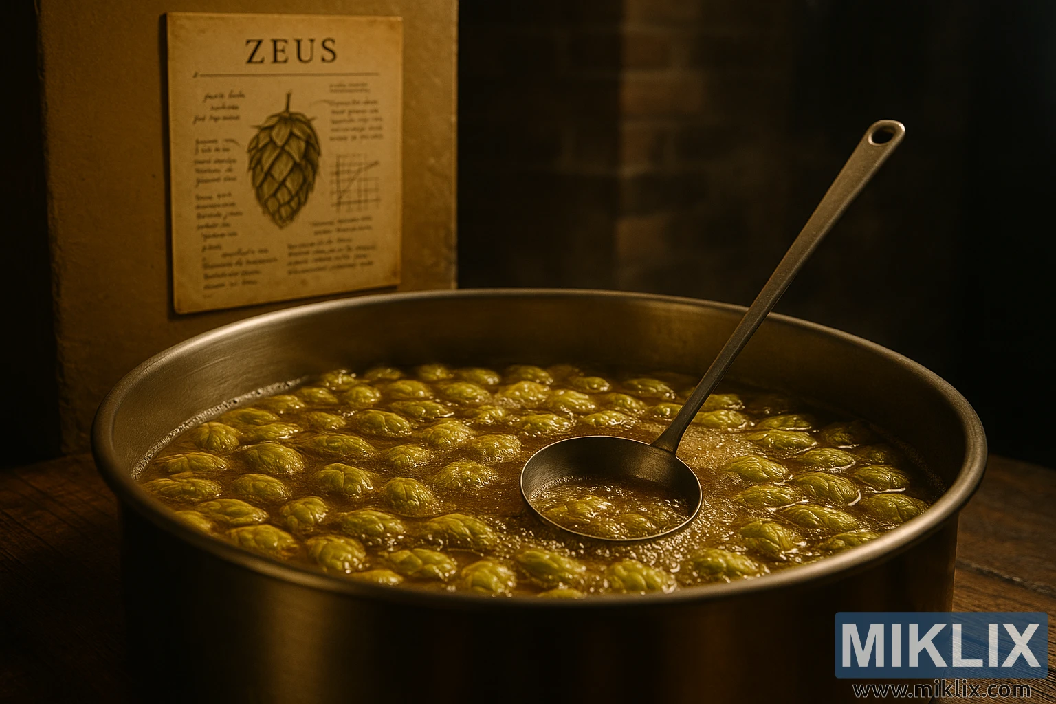 Топла, темпераментна сцена со котел исполнет со хмељ од Зевс и златна течност, лажица што ја меша смесата и детални технички белешки во традиционална пиварница од тули.
