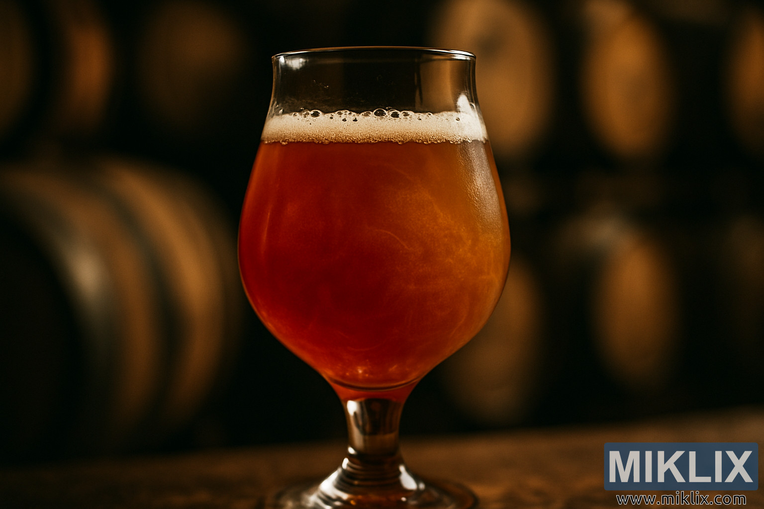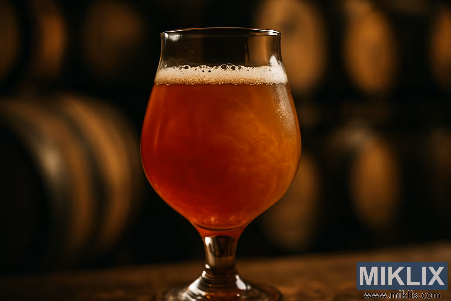 Чаша во форма на лале содржи магливо килибарно кисело пиво со нежен прстен од пена, кое топло свети на нежно заматена позадина од наредени дрвени буриња.