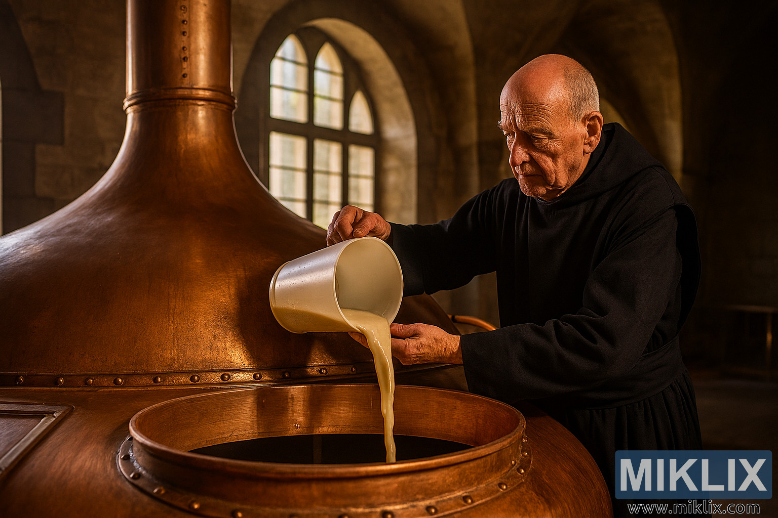 Свечен монах во црни мантии истура течен квасец во резервоар за ферментација од бакар во историска белгиска пиварница во манастир, осветлена со засводени прозорци и проткаена со вековна традиција на производство на пиво.