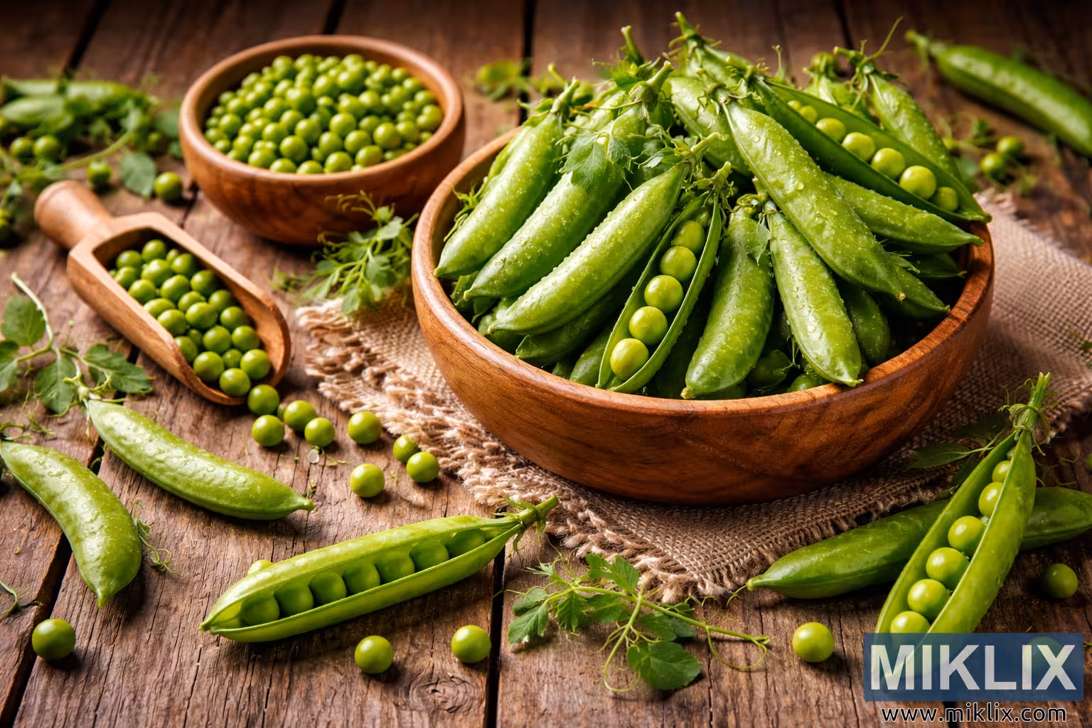 സമൃദ്ധമായ വിശദമായ, ഉയർന്ന റെസല്യൂഷനുള്ള ഒരു ഭക്ഷണ ഫോട്ടോ, ലാൻഡ്സ്കേപ്പ് ഓറിയന്റേഷനിൽ ഒരു നാടൻ മര മേശപ്പുറത്ത് ക്രമീകരിച്ചിരിക്കുന്ന പുതിയ പച്ച പയറുകളുടെ ആകർഷകമായ നിശ്ചല ജീവിതം അവതരിപ്പിക്കുന്നു. മധ്യഭാഗത്ത് വിശാലമായ, ആഴം കുറഞ്ഞ ഒരു മരപ്പാത്രം തിളങ്ങുന്ന പയറുവർഗ്ഗങ്ങൾ കൊണ്ട് നിറഞ്ഞിരിക്കുന്നു, അവയുടെ തൊലികൾ മുറുക്കി, അവ കഴുകിയതോ പുതുതായി വിളവെടുത്തതോ ആണെന്ന് സൂചിപ്പിക്കുന്ന ചെറിയ ഈർപ്പമുള്ള മണികളാൽ തിളങ്ങുന്നു. നിരവധി കായകൾ പിളർന്ന്, ഉള്ളിൽ തികച്ചും വൃത്താകൃതിയിലുള്ള പയറുവർഗ്ഗങ്ങൾ കാണിക്കുന്നു, അവയുടെ മിനുസമാർന്ന പ്രതലങ്ങൾ ചൂടുള്ള ആംബിയന്റ് ലൈറ്റ് പ്രതിഫലിപ്പിക്കുന്നു. പയറുവർഗ്ഗങ്ങൾ പച്ചപ്പിന്റെ ഒരു സ്പെക്ട്രത്തിൽ തിളങ്ങുന്നു, അഗ്രഭാഗത്ത് ഇളം മഞ്ഞ-പച്ച മുതൽ നിഴലുകളിൽ ആഴത്തിലുള്ള മരതക ഷേഡുകൾ വരെ, ഫ്രെയിമിലുടനീളം കണ്ണിനെ ആകർഷിക്കുന്ന ഒരു സ്വാഭാവിക ഗ്രേഡിയന്റ് സൃഷ്ടിക്കുന്നു.
