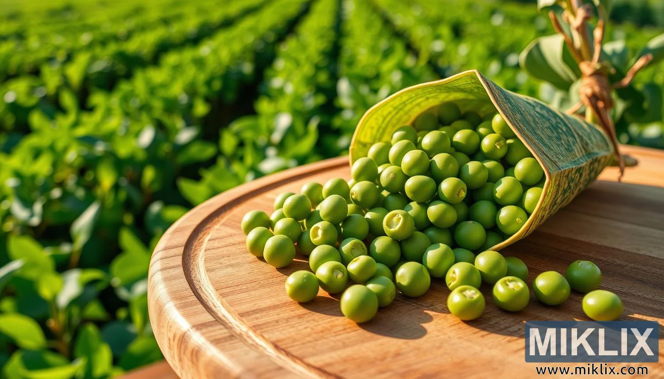 ഒരു മരപ്പലകയിലെ കായയിൽ നിന്ന് ഒഴുകിവരുന്ന തടിച്ച പച്ച പയറുകളുടെ ക്ലോസ്-അപ്പ്, പശ്ചാത്തലത്തിൽ ഒരു സമൃദ്ധമായ പയർപ്പാടം, പുതുമയെയും പോഷക ഗുണങ്ങളെയും പ്രതീകപ്പെടുത്തുന്നു.