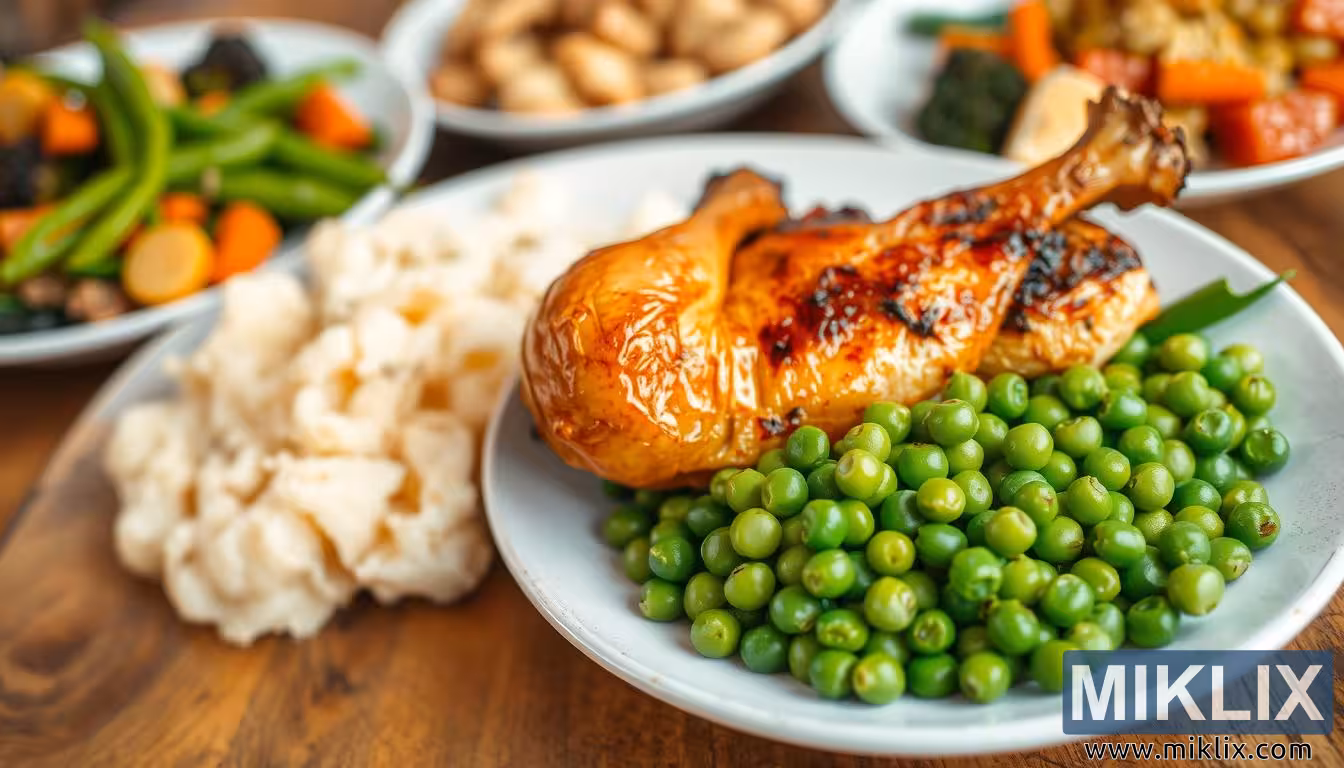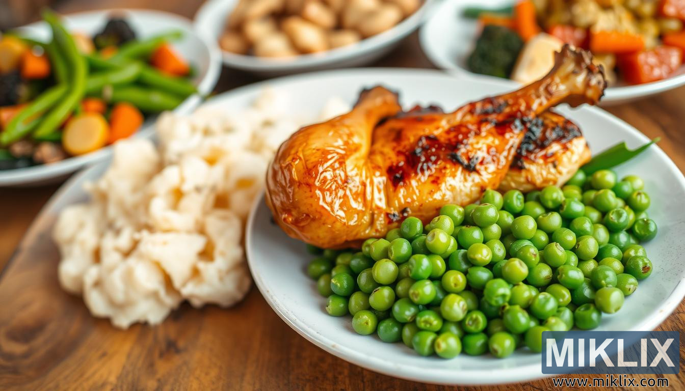ചൂടുള്ള വെളിച്ചത്തിൽ, സന്തുലിതാവസ്ഥയുടെയും പോഷണത്തിന്റെയും പ്രതീകമായി, വറുത്ത ചിക്കൻ, മാഷ് ചെയ്ത ഉരുളക്കിഴങ്ങ്, വഴറ്റിയ പച്ചക്കറികൾ, ഊർജ്ജസ്വലമായ ഗ്രീൻ പീസ് എന്നിവയുടെ ഒരു നാടൻ പ്ലേറ്റ്.