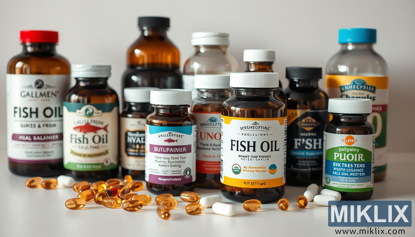 മത്സ്യ എണ്ണ കുപ്പികളുടെയും കാപ്സ്യൂളുകളുടെയും ഉയർന്ന നിലവാരമുള്ള ചിത്രം, ലഭ്യമായ സപ്ലിമെന്റുകളുടെ വൈവിധ്യവും ശ്രദ്ധാപൂർവ്വമായ തിരഞ്ഞെടുപ്പും എടുത്തുകാണിക്കുന്നു.