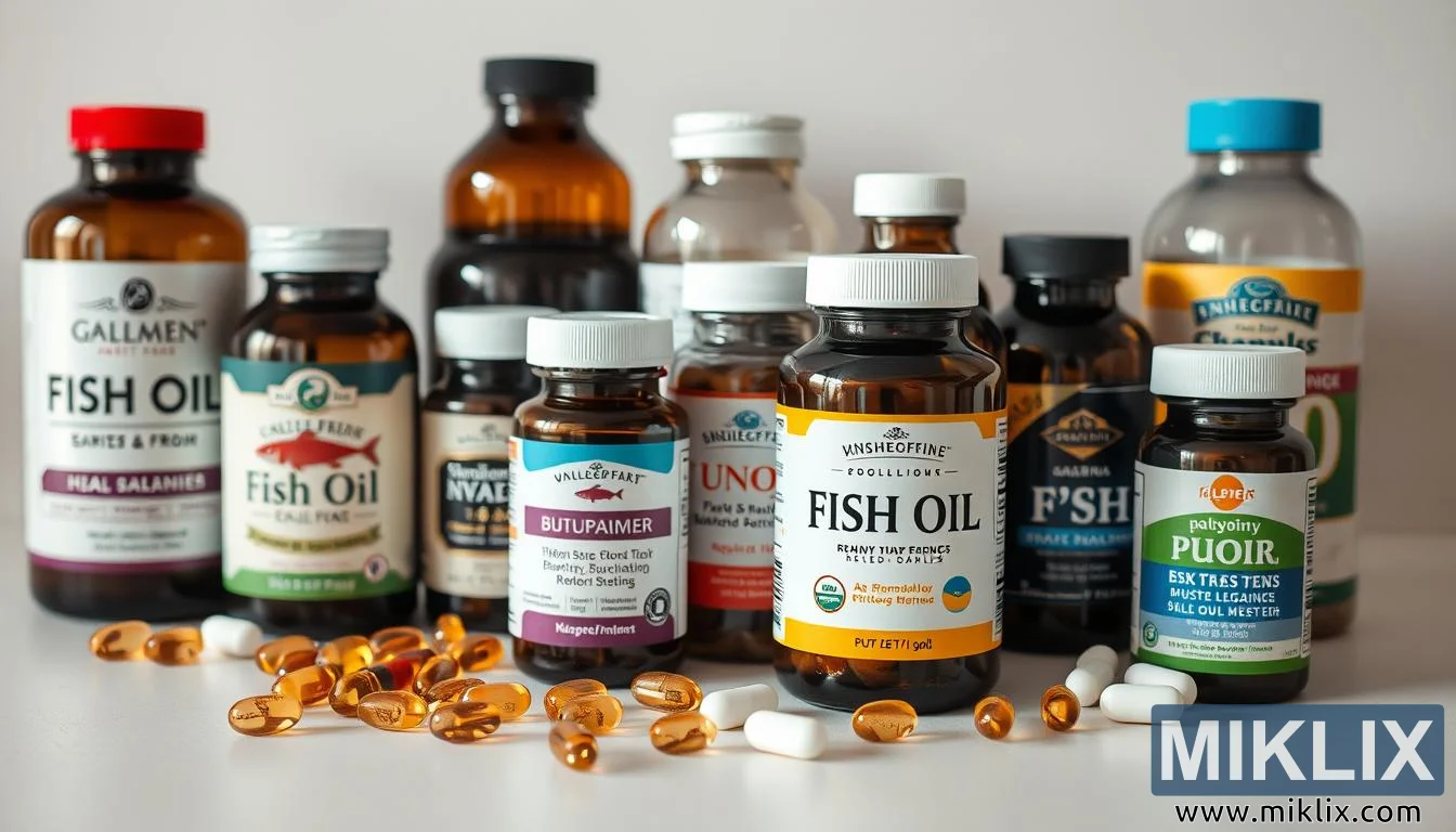Variety of fish oil supplements displayed