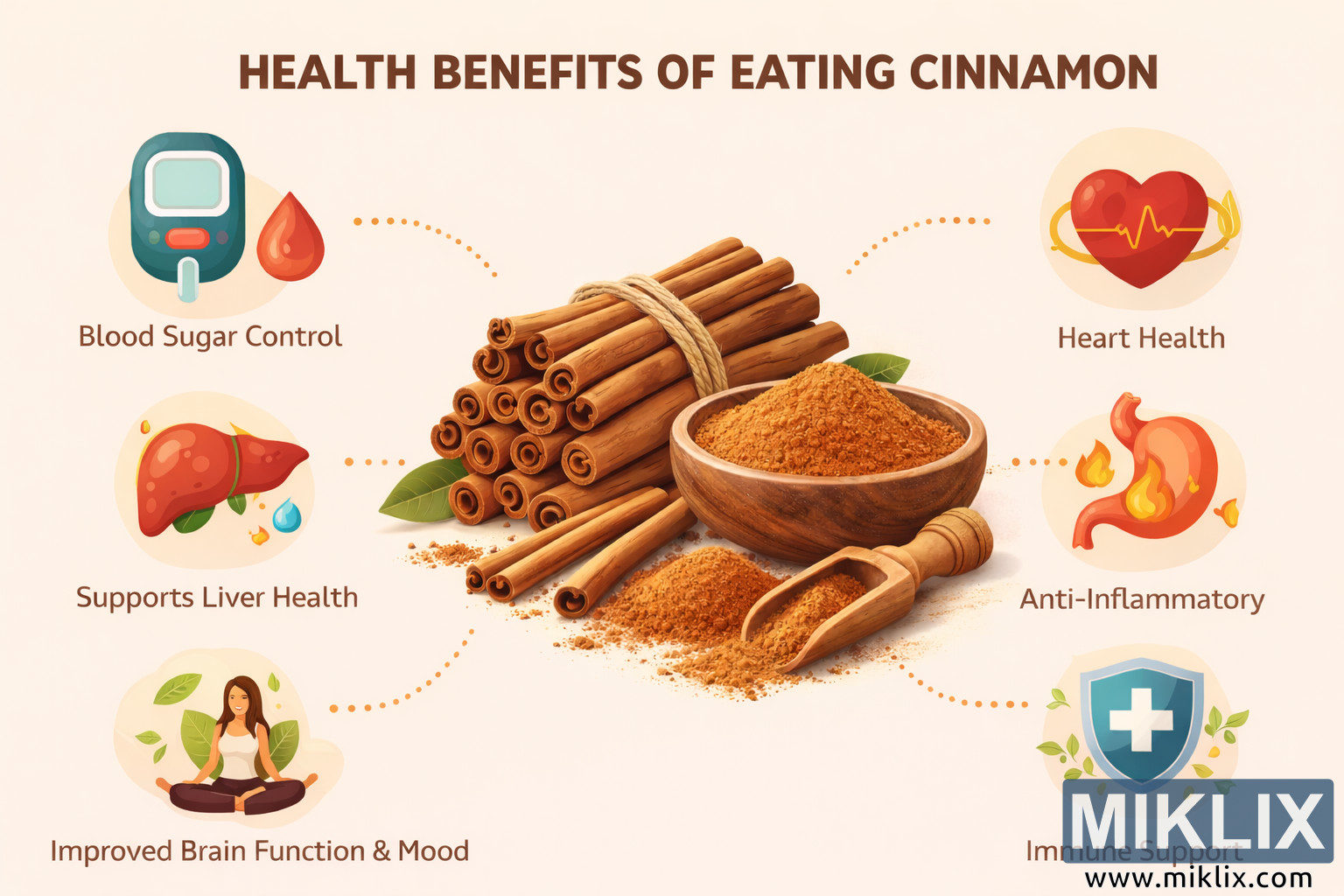 കറുവപ്പട്ട കഴിക്കുന്നതിന്റെ പ്രധാന ആരോഗ്യ ഗുണങ്ങൾ, രക്തത്തിലെ പഞ്ചസാര നിയന്ത്രണം, ഹൃദയാരോഗ്യം, രോഗപ്രതിരോധ പിന്തുണ എന്നിവ ചിത്രീകരിക്കുന്ന വിദ്യാഭ്യാസ ഇൻഫോഗ്രാഫിക്.