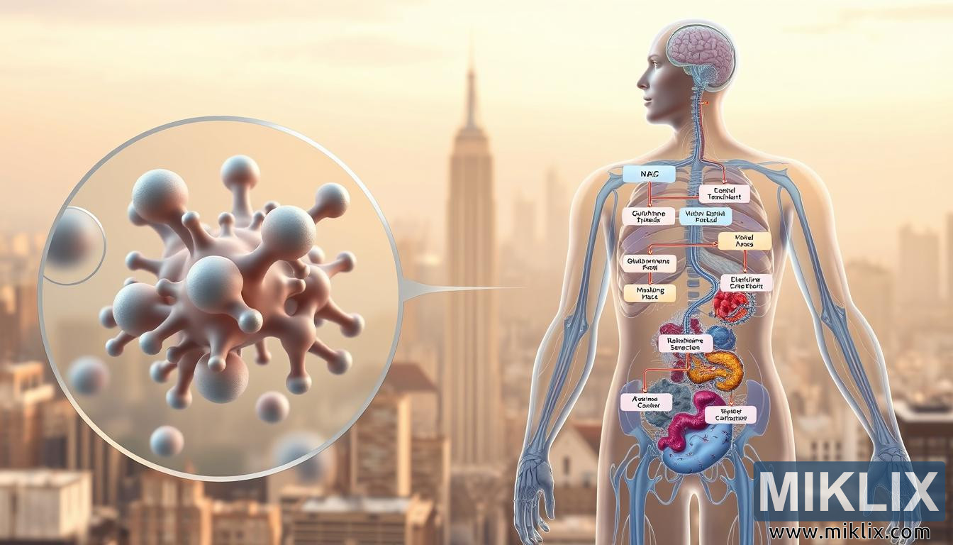 മനുഷ്യശരീരത്തിൽ എൻ-അസെറ്റൈൽ എൽ-സിസ്റ്റൈൻ (എൻഎസി) എങ്ങനെ പ്രവർത്തിക്കുന്നു, തന്മാത്രാ വിശദാംശങ്ങൾ, വ്യവസ്ഥാപരമായ പാതകൾ, വിശാലമായ പാരിസ്ഥിതിക പശ്ചാത്തലം എന്നിവ ഒരുമിച്ച് ചേർക്കുന്നു എന്നതിന്റെ ദൃശ്യപരമായി സമ്പന്നവും ശാസ്ത്രീയമായി പ്രചോദിതവുമായ ഒരു പ്രതിനിധാനം ഈ ചിത്രം നൽകുന്നു. മുൻപന്തിയിൽ, എൻഎസിയുമായി ബന്ധപ്പെട്ട തന്മാത്രാ ഘടനകളുടെ ഒരു വലുതാക്കിയ കൂട്ടം വ്യക്തതയോടും ആഴത്തോടും കൂടി ചിത്രീകരിച്ചിരിക്കുന്നു. അവയുടെ ശാഖിതമായ, ഗോളാകൃതിയിലുള്ള രൂപങ്ങൾ എൻഎസിയും സെല്ലുലാർ ഘടകങ്ങളും തമ്മിലുള്ള ചലനാത്മക ഇടപെടലുകളെ സൂചിപ്പിക്കുന്നു, പ്രത്യേകിച്ച് ഫ്രീ റാഡിക്കലുകളെ നിർവീര്യമാക്കുന്നതിലും വിഷവിമുക്തമാക്കൽ പ്രക്രിയകൾക്ക് സംഭാവന നൽകുന്നതിലും അതിന്റെ പങ്ക്. ഈ തന്മാത്രകളെ ചുറ്റിപ്പറ്റിയുള്ള സൂക്ഷ്മമായ തിളക്കം അവയുടെ സജീവ സ്വഭാവത്തെ ഊന്നിപ്പറയുന്നു, അവ സെല്ലുലാർ തലത്തിൽ നിലനിർത്താൻ സഹായിക്കുന്ന ബയോകെമിക്കൽ പ്രതിരോധ സംവിധാനങ്ങളെ പ്രതീകപ്പെടുത്തുന്നു. ഈ വലുതാക്കിയ വീക്ഷണം കാഴ്ചക്കാരനെ സൂക്ഷ്മ ലോകത്തേക്ക് ആകർഷിക്കുന്നു, അല്ലാത്തത് ദൃശ്യമാക്കുന്നു: ഓക്സിഡേറ്റീവ് സ്ട്രെസ്സറുകളെ തടസ്സപ്പെടുത്തുമ്പോൾ എൻഎസിയുടെ ആന്റിഓക്സിഡന്റ് ശക്തി.