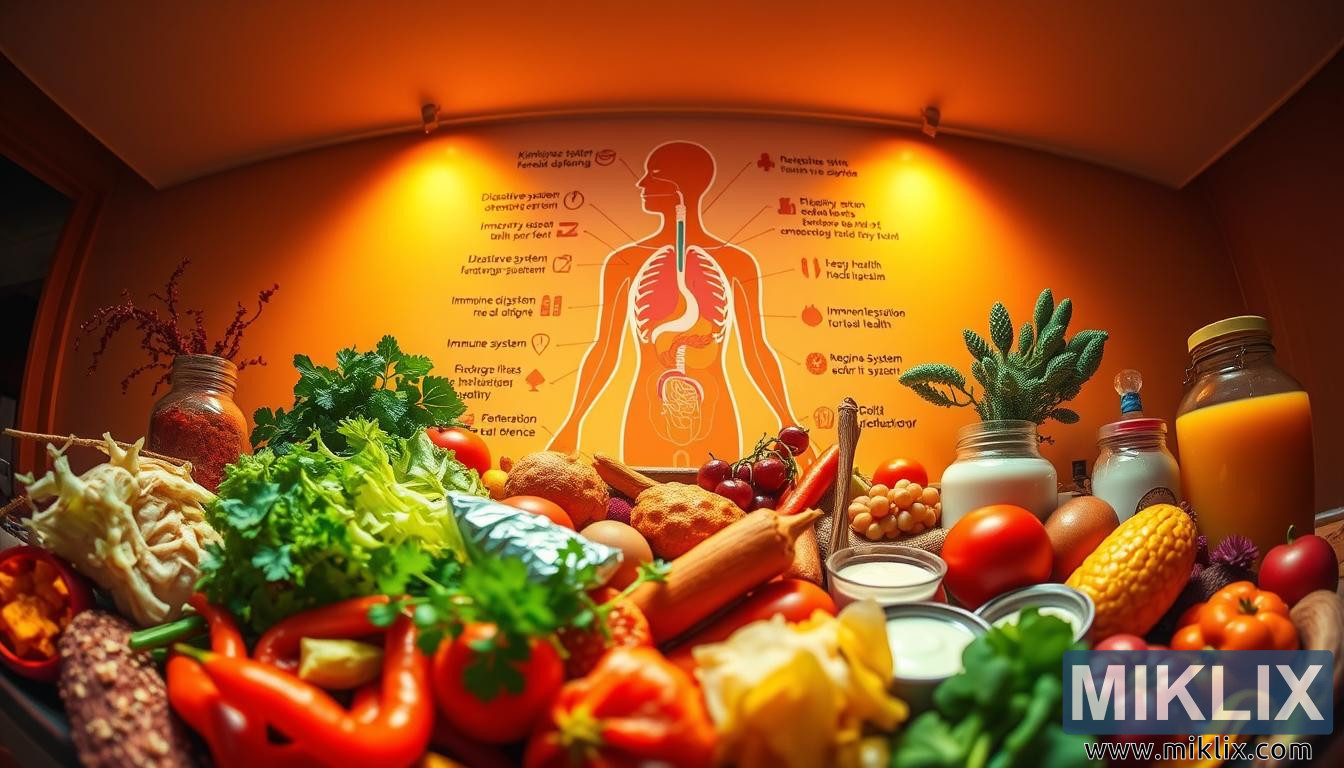 കിംചി, സോർക്രാട്ട്, കൊമ്പുച്ച, തൈര് എന്നിവയുടെ ചലനാത്മക ചിത്രീകരണം, അഴുകലിന്റെ കുടൽ, രോഗപ്രതിരോധ, ഹൃദയാരോഗ്യ ഗുണങ്ങൾ എടുത്തുകാണിക്കുന്ന ഒരു ഡയഗ്രം.