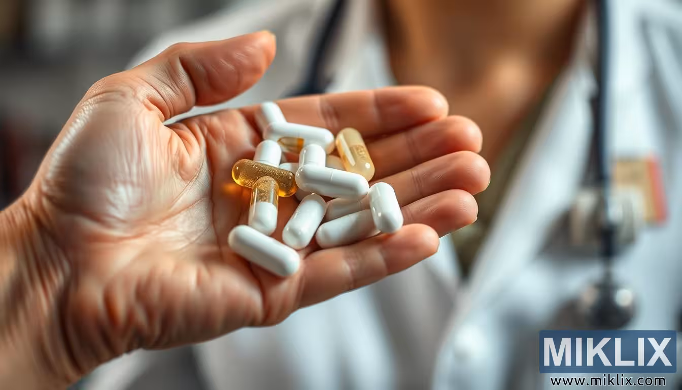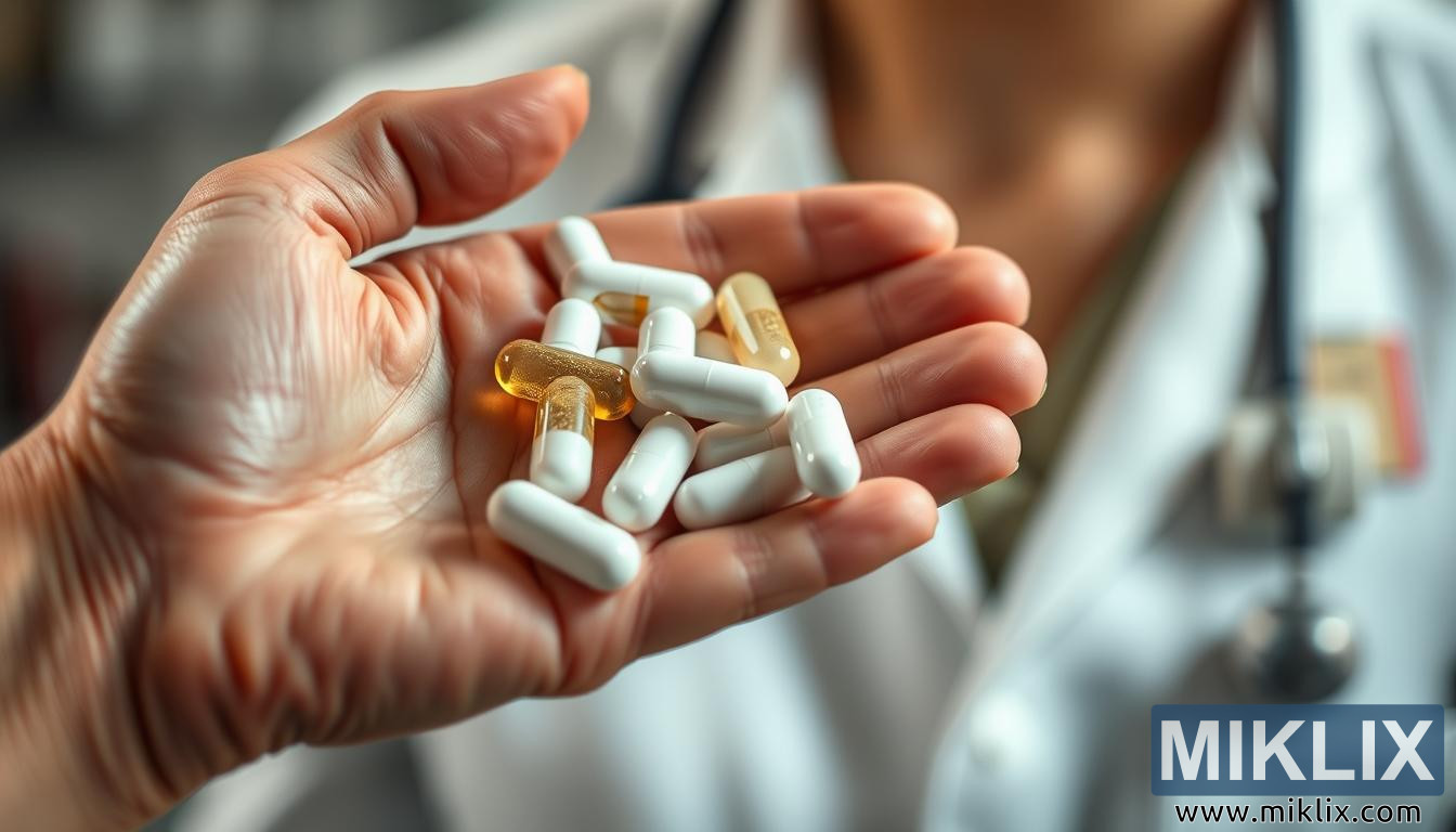പശ്ചാത്തലം മങ്ങിയതായി കാണാം, അതിന്റെ അവ്യക്തമായ വിശദാംശങ്ങൾ ഒരു മെഡിക്കൽ അല്ലെങ്കിൽ ക്ലിനിക്കൽ സാഹചര്യത്തെ സൂചിപ്പിക്കുന്നു. വെളുത്ത കോട്ട് ധരിച്ച ഒരു വ്യക്തിക്ക് ചുറ്റുമുള്ള സ്റ്റെതസ്കോപ്പിന്റെ മങ്ങിയ രൂപരേഖ, ആരോഗ്യ സംരക്ഷണത്തിന്റെയും പ്രൊഫഷണൽ മേൽനോട്ടത്തിന്റെയും പശ്ചാത്തലത്തിൽ സൂക്ഷ്മമായി രംഗം വിശദീകരിക്കുന്നു. മുഖം ഫോക്കസിൽ നിന്ന് പുറത്തുപോകുമ്പോൾ, മെഡിക്കൽ വസ്ത്രത്തിന്റെ സാന്നിധ്യം ഉറപ്പും ജാഗ്രതയും ഉണർത്തുന്നു. കൈയിലുള്ള സപ്ലിമെന്റുകൾ വെറും ഉപഭോക്തൃ ഉൽപ്പന്നങ്ങളല്ല, മറിച്ച് രോഗിയും ഡോക്ടറും തമ്മിലുള്ള ഒരു വലിയ സംഭാഷണത്തിന്റെ ഭാഗമാണെന്ന് ഇത് സൂചിപ്പിക്കുന്നു - ചികിത്സ, ഫലപ്രാപ്തി, അപകടസാധ്യത എന്നിവയെക്കുറിച്ചുള്ള ഒരു സംഭാഷണം. മങ്ങിയ ഗുണനിലവാരം ഗുളികകളിലും കൈയിലും ശ്രദ്ധ കേന്ദ്രീകരിക്കുന്നുവെന്ന് ഉറപ്പാക്കുന്നു, എന്നിരുന്നാലും ഇത് ചിത്രത്തിൽ സ്ഥാപനപരമായ ഭാരത്തിന്റെ ഒരു ബോധം കൂടി നൽകുന്നു, ഇത് മെഡിക്കൽ തീരുമാനങ്ങൾ എടുക്കുന്നതിന്റെ ഗൗരവം അടിവരയിടുന്നു.