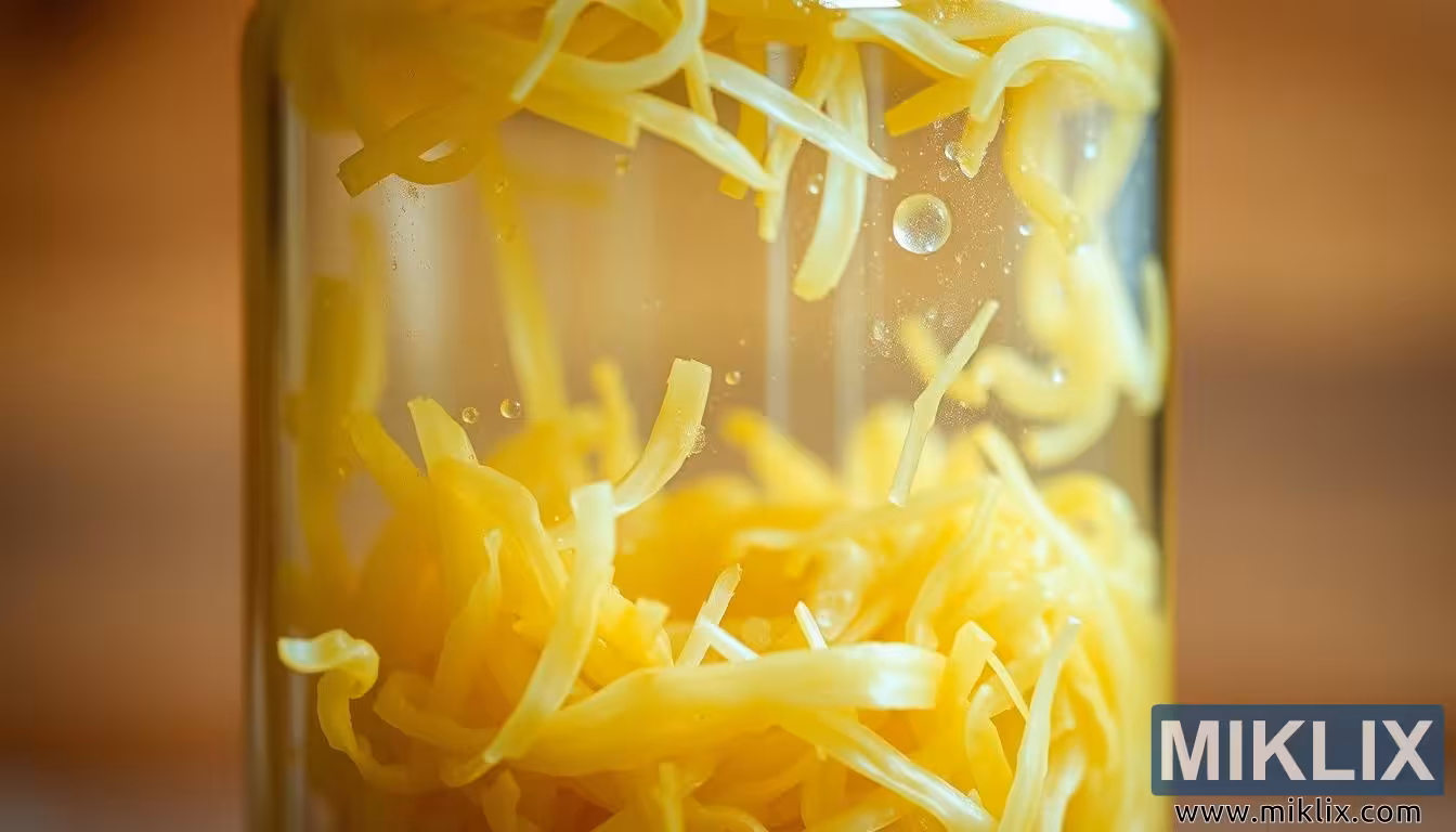 ഒരു ഗ്ലാസ് പാത്രത്തിൽ, കുമിളകൾ പോലെ കാണപ്പെടുന്ന പ്രോബയോട്ടിക് സംസ്കാരങ്ങളോടെ, പൊടിച്ച സ്വർണ്ണ സോർക്രാട്ടിന്റെ ക്ലോസ്-അപ്പ്, അതിന്റെ പുതുമയും സ്വാഭാവിക സത്തയും എടുത്തുകാണിക്കുന്നതിനായി മൃദുവായി പ്രകാശിപ്പിക്കുന്നു.