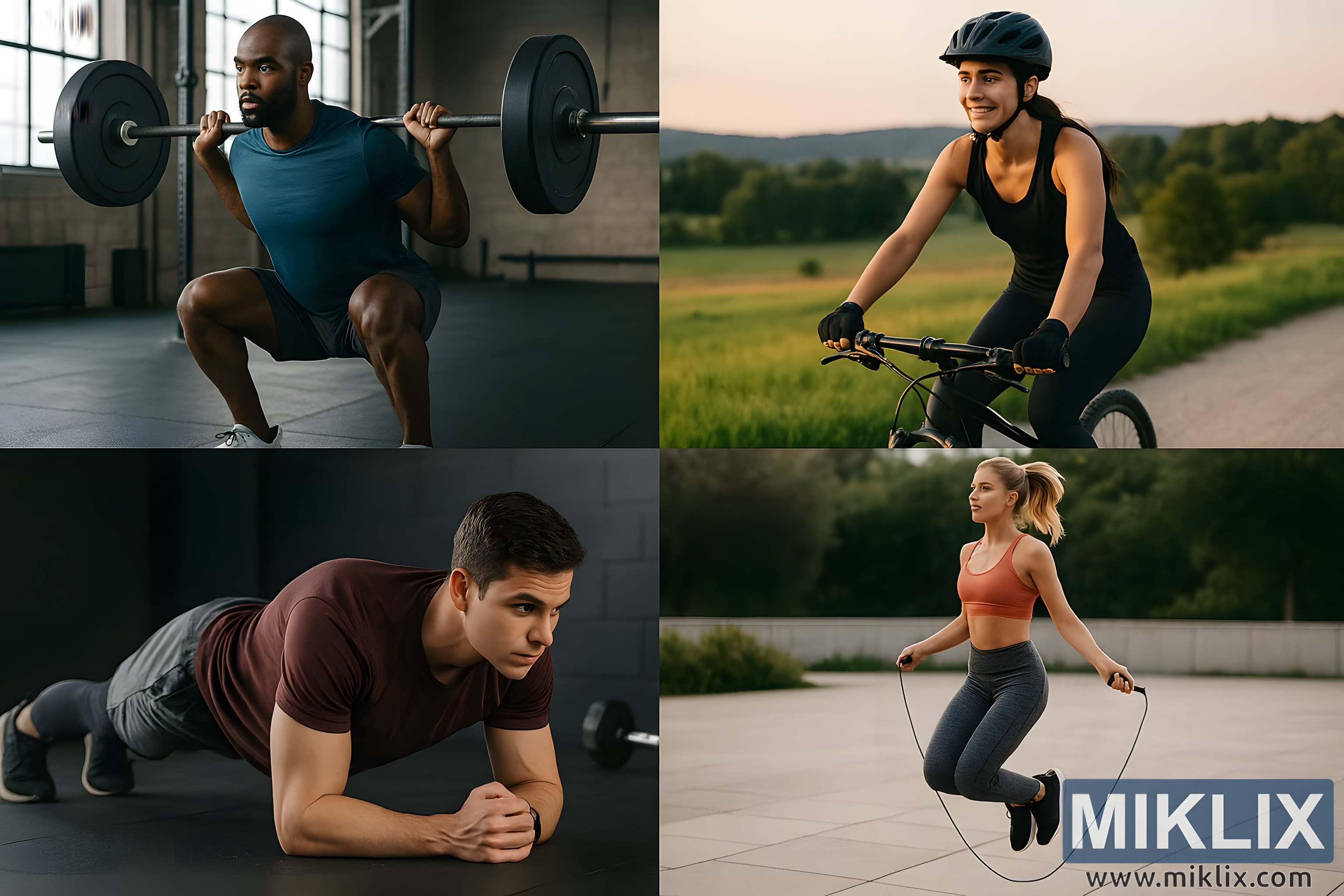 ശക്തി പരിശീലനം, സൈക്ലിംഗ്, പ്ലാങ്കിംഗ്, ജമ്പ് റോപ്പ് എന്നിവ പ്രദർശിപ്പിക്കുന്ന നാല് ഫ്രെയിം കൊളാഷ്, ഇൻഡോർ, ഔട്ട്ഡോർ വ്യായാമത്തിന്റെ വൈവിധ്യം എടുത്തുകാണിക്കുന്നു.