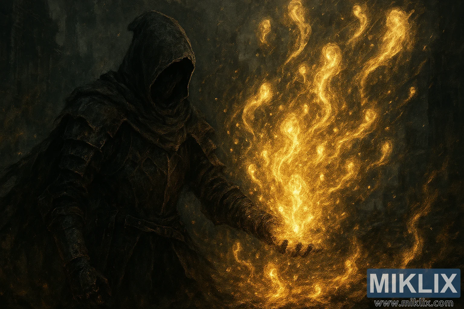 തകർന്ന, ഗോതിക് പശ്ചാത്തലത്തിൽ, ഷാഡോ ആർമറിൽ, സോളുകളുടെ ഒരു പ്രവാഹത്തെ ആഗിരണം ചെയ്യുന്ന ആഷെൻ വണ്ണിന്റെ, ഡാർക്ക് സോൾസ് III-ൽ നിന്ന് പ്രചോദനം ഉൾക്കൊണ്ട ഒരു ഡിജിറ്റൽ പെയിന്റിംഗ്.