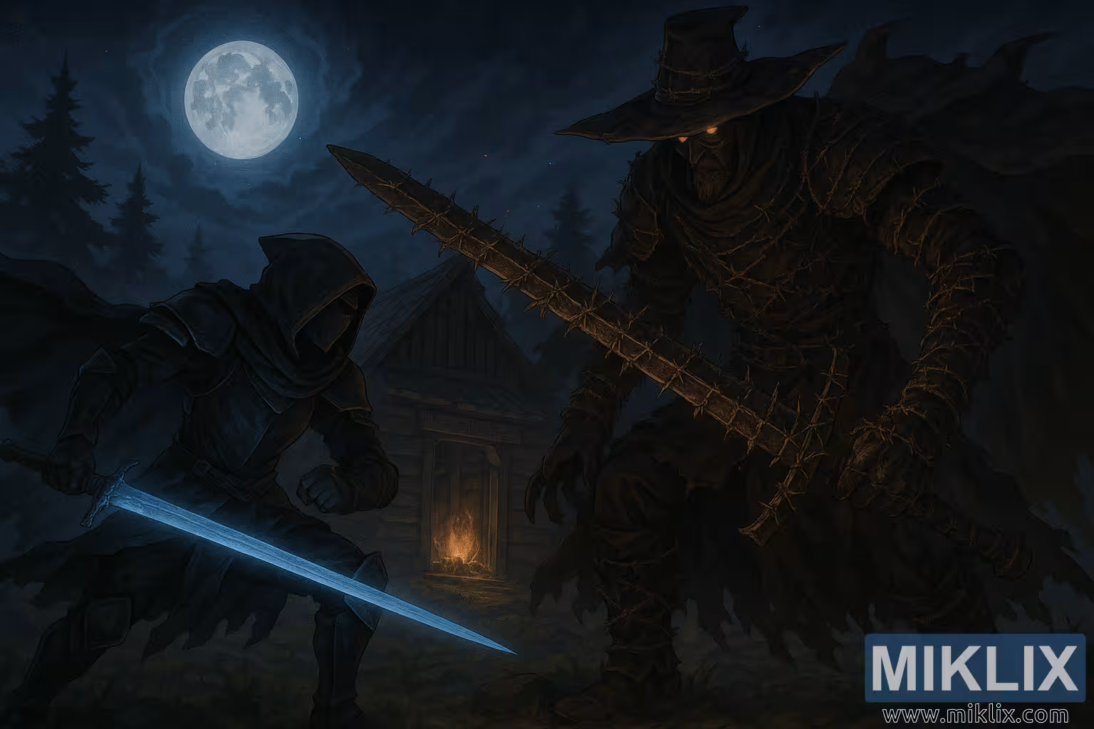 നാടകീയമായ എൽഡൻ റിംഗ് ഫാൻ ആർട്ട്: ഹെർമിറ്റ് മർച്ചന്റ്സ് ഷാക്കിൽ ഒരു ചന്ദ്രപ്രകാശമുള്ള യുദ്ധത്തിൽ, മുള്ളുവേലിയിൽ പൊതിഞ്ഞ് ഒരു വലിയ വാളേന്തിയ ബെൽ ബെയറിംഗ് ഹണ്ടറുമായി ഒരു ടാർണിഷ്ഡ് ഇൻ ബ്ലാക്ക് നൈഫ് കവചം ഏറ്റുമുട്ടുന്നു.