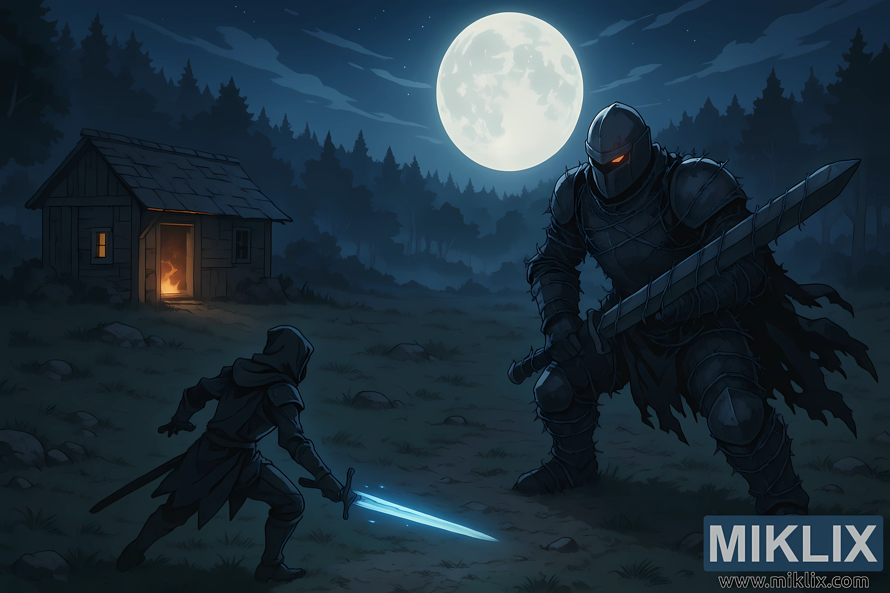 എൽഡൻ റിംഗിലെ ഹെർമിറ്റ് മർച്ചന്റ്സ് ഷാക്കിനെ ചുറ്റിപ്പറ്റിയുള്ള ഏകാന്തമായ സ്ഥലത്ത്, ഒരു ടാർണിഷഡ്, ബെൽ ബെയറിംഗ് ഹണ്ടർ എന്നിവർ തമ്മിലുള്ള പിരിമുറുക്കമുള്ള രാത്രികാല ഏറ്റുമുട്ടലിന്റെ ഒരു പിൻവലിഞ്ഞ, അല്പം ഉയർന്ന ഐസോമെട്രിക് കാഴ്ചയാണ് ഈ കലാസൃഷ്ടി അവതരിപ്പിക്കുന്നത്. രാത്രി ആകാശത്തെ ആധിപത്യം സ്ഥാപിക്കുകയും പുല്ലിനും താഴെയുള്ള രൂപങ്ങൾക്കും മുകളിൽ മൃദുവായ വെള്ളി വിതറുകയും ചെയ്യുന്ന വിളറിയ പ്രകാശത്താൽ തിളങ്ങുന്ന വിശാലമായ, തിളക്കമുള്ള പൂർണ്ണചന്ദ്രന്റെ കീഴിലാണ് ഈ ദൃശ്യം ഫ്രെയിം ചെയ്തിരിക്കുന്നത്. നേർത്ത മേഘങ്ങൾ ആകാശത്ത് നെയ്തെടുക്കുന്നു, പക്ഷേ ചന്ദ്രൻ ശക്തവും പൂർണ്ണമായും ദൃശ്യവുമായി തുടരുന്നു, ഏതാണ്ട് മുഴുവൻ രചനയെയും പ്രകാശിപ്പിക്കുന്നു.