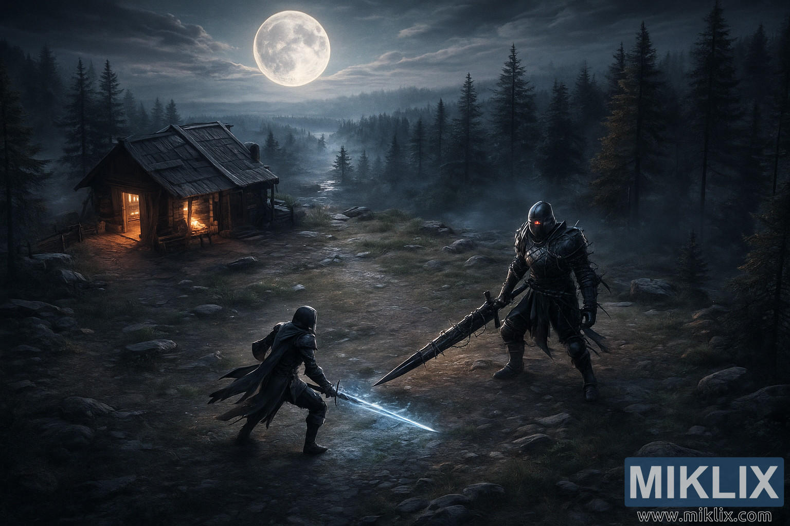 അക്രമത്തിന് മുമ്പുള്ള നിശ്ചലതയിൽ പൂട്ടിയിരിക്കുന്ന രണ്ട് പോരാളികളാണ് കളത്തിൽ കേന്ദ്രീകൃതമായിരിക്കുന്നത്. കറുത്ത നൈഫ് കവചം ധരിച്ച്, ഇരുണ്ട ലോഹ കവചം ധരിച്ച്, ചന്ദ്രന്റെ പ്രതിഫലന തിളക്കത്തിനെതിരെ ശാന്തവും മാരകവുമാണ് ടാർണിഷ്ഡ്. അവരുടെ കേപ്പ് മൃദുവായ മടക്കുകളിൽ അവരുടെ പിന്നിൽ സഞ്ചരിക്കുന്നു, അവർ പിടിക്കുന്ന ബ്ലേഡിന്റെ മങ്ങിയ ഇളം തിളക്കം മാത്രം സ്പർശിക്കുന്നു. വാൾ സ്പെക്ട്രൽ നീലയെ പ്രസരിപ്പിക്കുന്നു, പ്രകാശത്തെ പ്രതിഫലിപ്പിക്കുക മാത്രമല്ല, അത് സൃഷ്ടിക്കുന്നു - തണുത്ത തീ അല്ലെങ്കിൽ ഘനീഭവിച്ച നക്ഷത്രപ്രകാശം പോലെ ഉരുക്കിൽ നിന്ന് ഒഴുകുന്ന ശക്തി. ടാർണിഷ്ഡിന്റെ നിലപാട് നിയന്ത്രിതമാണ്, താഴ്ന്നതാണ്, ഭാരം മുന്നോട്ട്: അശ്രദ്ധമായ ആക്രമണത്തേക്കാൾ അളന്ന സന്നദ്ധത.