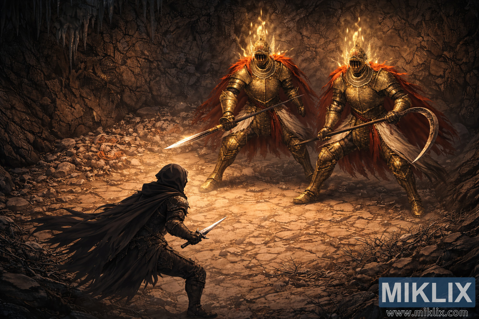 എൽഡൻ റിംഗിലെ ഉപേക്ഷിക്കപ്പെട്ട ഗുഹയ്ക്കുള്ളിൽ, ഇരട്ട ക്ലീൻറോട്ട് നൈറ്റ്സിനെ നേരിടുന്ന ടാർണിഷഡ് വംശജരെ കാണിക്കുന്ന ഹൈ-ആംഗിൾ ഐസോമെട്രിക് ഫാൻ ആർട്ട്.
