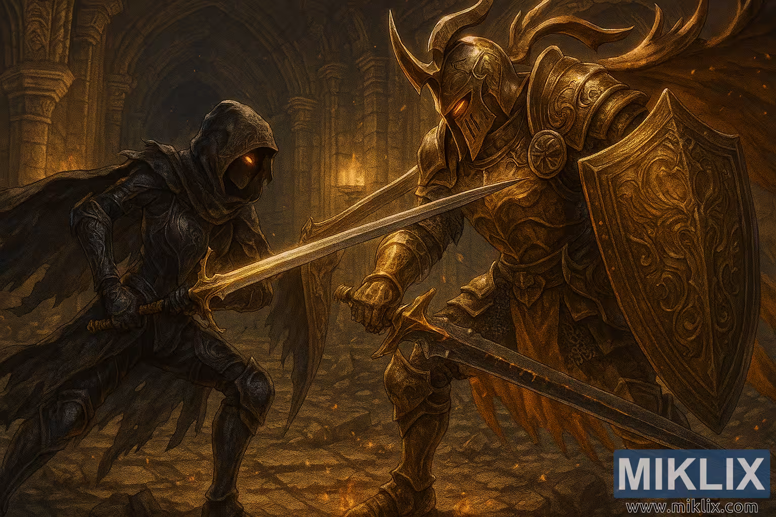 ഓറിസ ഹീറോയുടെ ശവകുടീരത്തിന്റെ നിഴൽ നിറഞ്ഞ ആഴങ്ങളിൽ, ആനിമേഷൻ ശൈലിയിലുള്ള ഫാൻ ആർട്ടിൽ അവതരിപ്പിക്കുന്ന ഉയർന്ന മത്സരത്തിൽ രണ്ട് ഇതിഹാസ യോദ്ധാക്കൾ ഏറ്റുമുട്ടുന്നു. പുരാതന റണ്ണുകൾ കൊത്തിയെടുത്തതും മിന്നുന്ന മെഴുകുതിരികളാൽ പ്രകാശിതവുമായ ഉയർന്ന കൽത്തൂണുകളുള്ള വിശാലമായ, കത്തീഡ്രൽ പോലുള്ള ഒരു ക്രിപ്റ്റിനുള്ളിലാണ് ഈ രംഗം സജ്ജീകരിച്ചിരിക്കുന്നത്. പൊടിപടലങ്ങളും തിളങ്ങുന്ന തീക്കനലുകളും വായുവിലൂടെ ഒഴുകിവന്ന് യുദ്ധക്കളത്തിൽ ഒരു നിഗൂഢമായ മൂടൽമഞ്ഞ് സൃഷ്ടിക്കുന്നു.