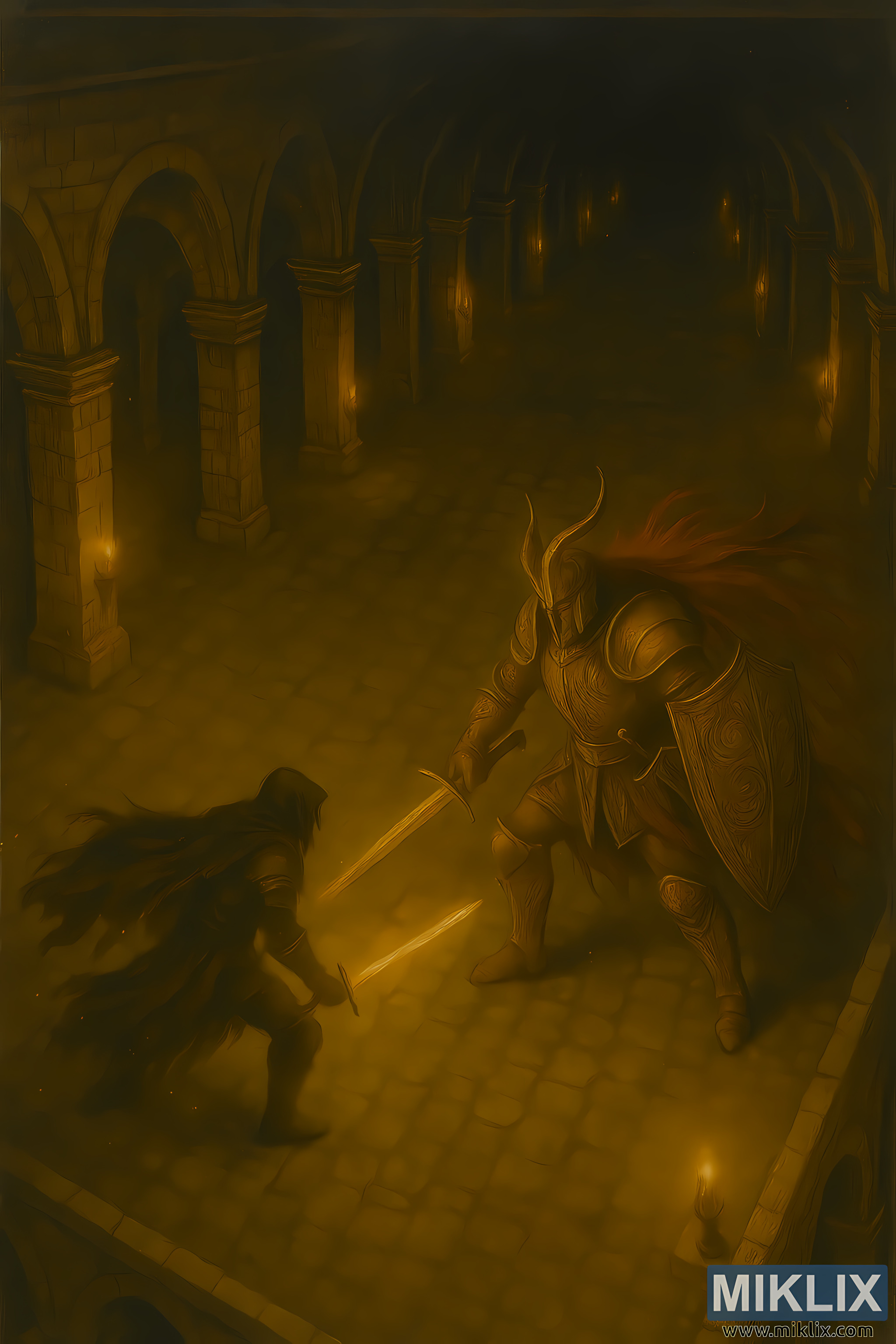 ദൂരേക്ക് നീണ്ടുകിടക്കുന്ന ഹാൾ, നൂറ്റാണ്ടുകളുടെ പഴക്കം തെളിയിക്കുന്ന, ജീർണിച്ചതും ക്രമരഹിതവുമായ ഉരുളൻ കല്ലുകൾ കൊണ്ട് തറ പാകിയിരിക്കുന്നു. ഇരുവശത്തും കൂറ്റൻ കൽത്തൂണുകൾ ഉയർന്നുനിൽക്കുന്നു, നിഴലിലേക്ക് പിൻവാങ്ങുന്ന വൃത്താകൃതിയിലുള്ള കമാനങ്ങളെ പിന്തുണയ്ക്കുന്നു, പശ്ചാത്തലത്തിൽ ആഴത്തിലുള്ള ഒരു അപ്രത്യക്ഷമായ ബിന്ദുവിലേക്ക് കാഴ്ചക്കാരന്റെ കണ്ണിനെ നയിക്കുന്ന ഒരു താളാത്മകമായ കൊളോണേഡ് രൂപപ്പെടുത്തുന്നു. കാലക്രമേണ വിള്ളലുകൾ, ചിപ്പുകൾ, നിറവ്യത്യാസം എന്നിവയാൽ ഈ കല്ലുകൾ പഴകിയതും ഘടനാപരവുമാണ്. തൂണുകളിൽ ഘടിപ്പിച്ചിരിക്കുന്ന ചുമരിൽ ഘടിപ്പിച്ചിരിക്കുന്ന ടോർച്ചുകൾ ഊഷ്മളവും മിന്നുന്നതുമായ ഒരു തിളക്കം നൽകുന്നു, ഇത് സ്ഥലത്തെ സ്വർണ്ണ വെളിച്ചത്താൽ പ്രകാശിപ്പിക്കുകയും തറയിലും ചുവരുകളിലും നൃത്തം ചെയ്യുന്ന നാടകീയമായ നിഴലുകൾ സൃഷ്ടിക്കുകയും ചെയ്യുന്നു.