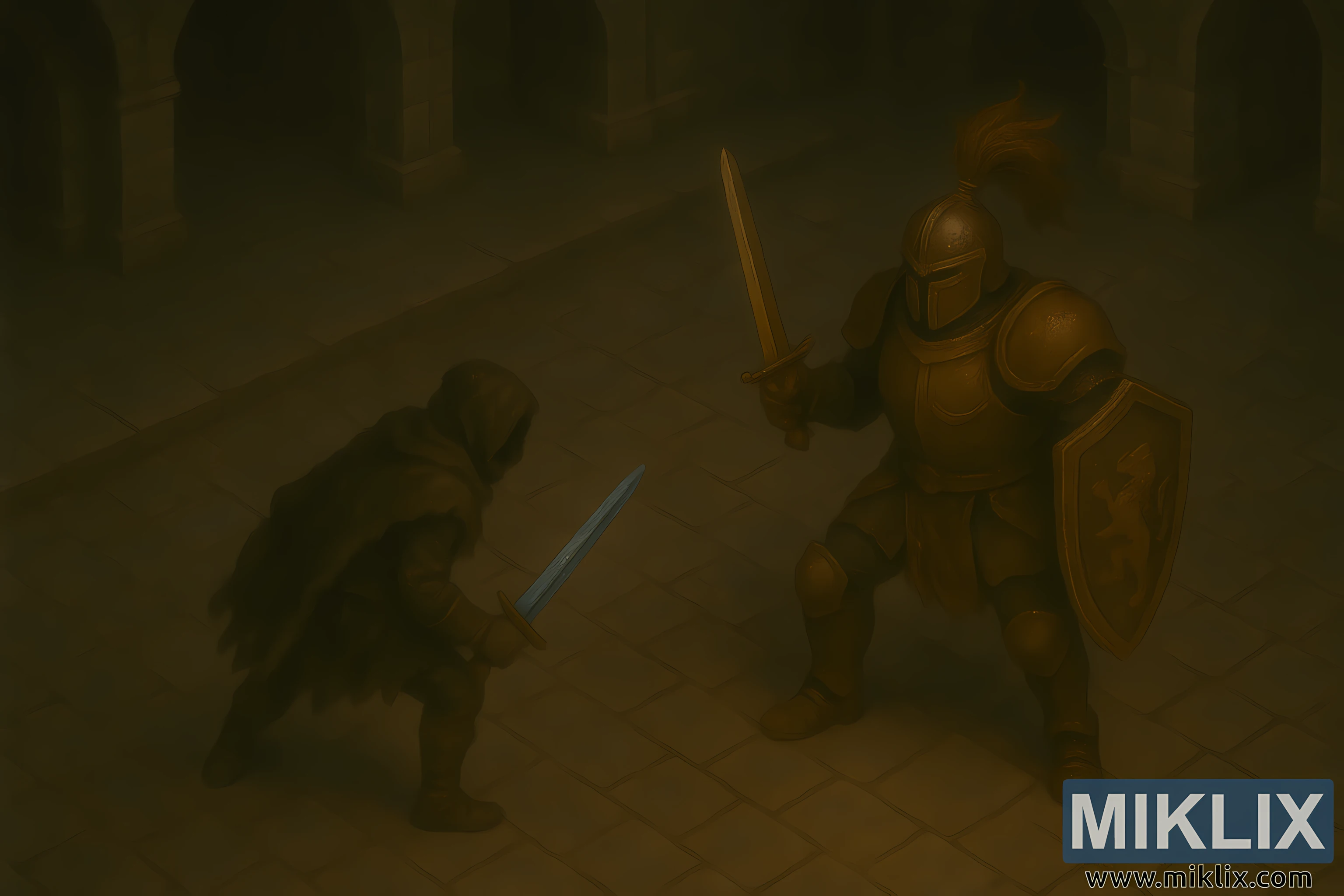 ചുറ്റുമുള്ള മുറി ഭാരമേറിയതും നിശബ്ദവുമാണ്. പൊടിപടലങ്ങൾ നീങ്ങുന്നില്ല, ചലനത്തിന്റെ മങ്ങലില്ല - അക്രമത്തിന്റെ പ്രതീക്ഷ മാത്രം. വെളിച്ചം അസമമായി രംഗത്തേക്ക് വീഴുന്നു, ഒരു വശത്ത് ചൂടുള്ള സ്വർണ്ണം, മറുവശത്ത് ശാന്തമായ നീല, അവരുടെ ആയുധങ്ങൾ വൈകാരിക എതിർബിന്ദുക്കളായി പ്രവർത്തിക്കുന്നു. മങ്ങിയവരുടെ സാന്നിധ്യം ശാന്തമായ ദൃഢനിശ്ചയത്തെ പ്രതിനിധീകരിക്കുന്നു, നൈറ്റിന്റെ ജ്വലിക്കുന്ന ആയുധം ശക്തിയും അനിവാര്യതയും പ്രസരിപ്പിക്കുന്നു. അവരുടെ എതിർപ്പ് വ്യക്തിപരമായതിനേക്കാൾ മൗലികമായി തോന്നുന്നു.