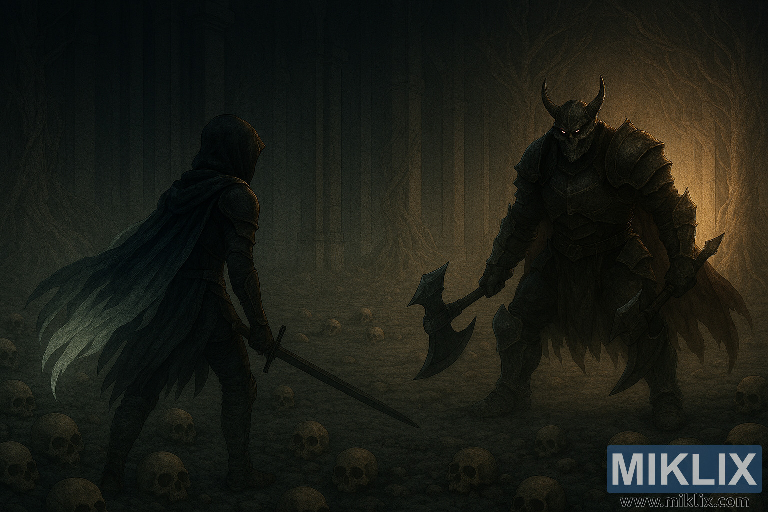 അയാൾക്ക് എതിർവശത്ത്, ഡെത്ത് നൈറ്റ്, മുല്ലയുള്ളതും മങ്ങിയതുമായ കവചം ധരിച്ച് സ്വർണ്ണ ആഭരണങ്ങളും പാളികളുള്ള പ്ലേറ്റുകളും ധരിച്ച്, കൊമ്പുള്ള ഒരു ഉയർന്ന രൂപമായി പ്രത്യക്ഷപ്പെടുന്നു. അയാളുടെ ഹെൽമെറ്റ് ഒരു കിരീടധാരിയായ തലയോട്ടി പോലെയാണ്, തിളങ്ങുന്ന ചുവന്ന കണ്ണുകൾ ഇരുട്ടിലൂടെ തുളച്ചുകയറുന്നു. അയാളുടെ തോളിൽ നിന്ന് ഒരു കീറിപ്പറിഞ്ഞ കടും ചുവപ്പ് കേപ്പ് പുറത്തുവന്നിരിക്കുന്നു, ഓരോ കൈയിലും അയാൾ ഒരു വലിയ ഇരട്ട തലയുള്ള യുദ്ധ കോടാലി പിടിച്ചിരിക്കുന്നു, അവയുടെ ബ്ലേഡുകൾ തേഞ്ഞുപോയി രക്തം പുരണ്ടിരിക്കുന്നു. അയാളുടെ നിലപാട് വിശാലവും ആക്രമണാത്മകവുമാണ്, കാൽമുട്ടുകൾ വളച്ച്, മഴു ഉയർത്തി, അടിക്കാൻ തയ്യാറാണ്.