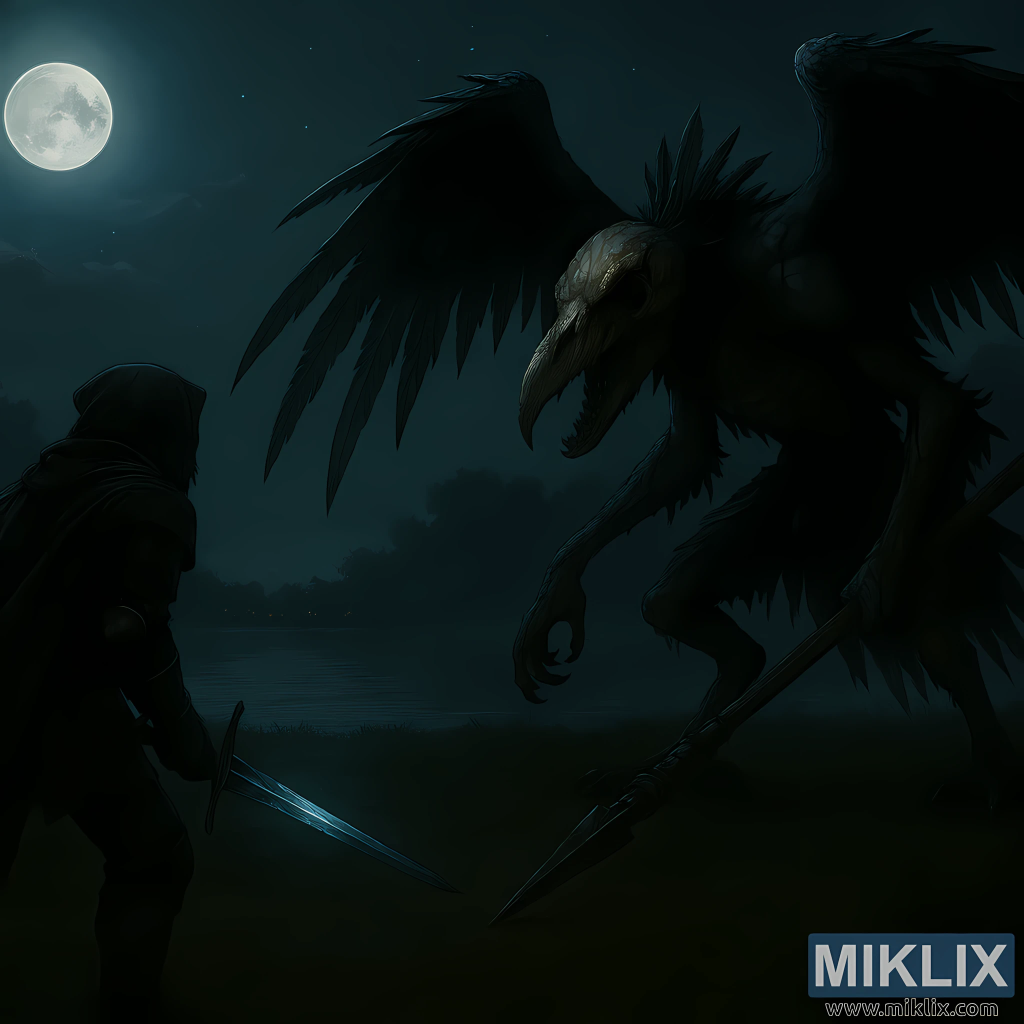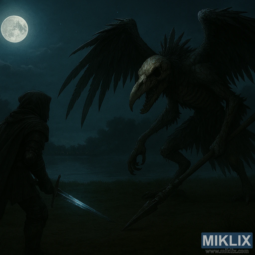 എൽഡൻ റിംഗിലെ സീനിക് ഐലിൽ ടാർണിഷും ഡെത്ത്ബേർഡ് ബോസും തമ്മിലുള്ള ഏറ്റുമുട്ടലിന്റെ ഒരു തണുത്ത നിമിഷം പകർത്തിയ ഈ ഇരുണ്ട ഫാന്റസി ഫാൻ ആർട്ട്, ക്ഷയം, പിരിമുറുക്കം, അന്തരീക്ഷം എന്നിവയ്ക്ക് പ്രാധാന്യം നൽകുന്ന ഒരു സെമി-റിയലിസ്റ്റിക് ശൈലിയിലാണ് ഇത് അവതരിപ്പിച്ചിരിക്കുന്നത്. മൂടൽമഞ്ഞുള്ള തടാകക്കരയിൽ വിളറിയതും നീലകലർന്നതുമായ ഒരു തിളക്കം പരത്തുന്ന ഒരു പൂർണ്ണചന്ദ്രനു കീഴിലാണ് ഈ രംഗം വികസിക്കുന്നത്. ആകാശം ആഴമേറിയതും നക്ഷത്രപ്പുള്ളികളുള്ളതുമാണ്, ചന്ദ്രനടുത്ത് മേഘങ്ങൾ ഒഴുകിനടക്കുന്നു. തടാകത്തിന് കുറുകെ ഒരു വിദൂര നഗരദൃശ്യം മങ്ങുന്നു, അതിന്റെ വെളിച്ചം മൂടൽമഞ്ഞിൽ മങ്ങി മരങ്ങളുടെ സിലൗട്ടുകൾ കൊണ്ട് ഫ്രെയിം ചെയ്തിരിക്കുന്നു.