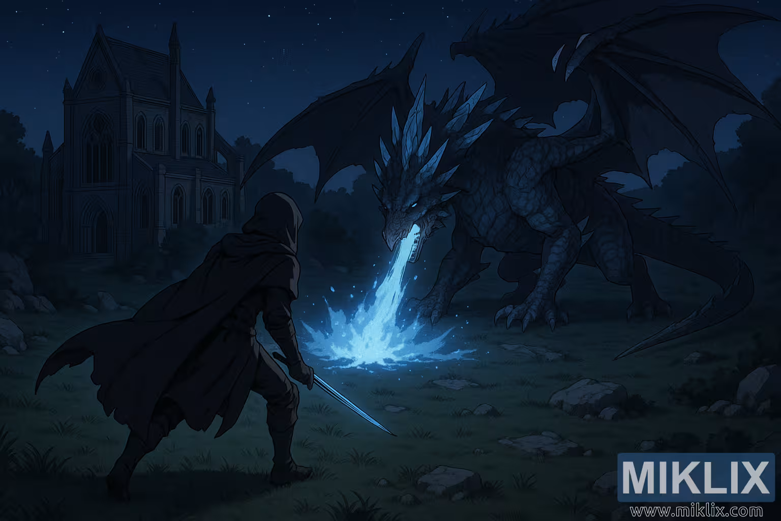 മുകളിൽ ഇടതുവശത്തുള്ള പശ്ചാത്തലത്തിൽ മനുസ് സെലസിലെ നശിച്ച കത്തീഡ്രൽ ഉയർന്നുനിൽക്കുന്നു. ഉയർന്ന കാഴ്ചപ്പാടിൽ നിന്ന് നോക്കുമ്പോൾ, അതിന്റെ ഗോതിക് വാസ്തുവിദ്യ - കമാനാകൃതിയിലുള്ള ജനാലകൾ, കുത്തനെയുള്ള മേൽക്കൂരകൾ, കാലാവസ്ഥ ബാധിച്ച കൽഭിത്തികൾ - രാത്രി ആകാശത്തിന് നേരെ വ്യക്തമായി നിർവചിച്ചിരിക്കുന്നു. കത്തീഡ്രൽ ഉപേക്ഷിക്കപ്പെട്ടതും ഗൗരവമേറിയതുമായി കാണപ്പെടുന്നു, ഭാഗികമായി ഇരുട്ടിൽ മുങ്ങി, മരങ്ങളും അസമമായ ഭൂപ്രകൃതിയും കൊണ്ട് ചുറ്റപ്പെട്ടിരിക്കുന്നു. അതിന്റെ സാന്നിധ്യം ചരിത്രബോധം, വിഷാദം, സ്കെയിൽ എന്നിവ കൂട്ടിച്ചേർക്കുന്നു, അതിനു മുന്നിൽ വികസിക്കുന്ന ഏറ്റുമുട്ടലിന്റെ പുരാണ ഭാരം ശക്തിപ്പെടുത്തുന്നു.