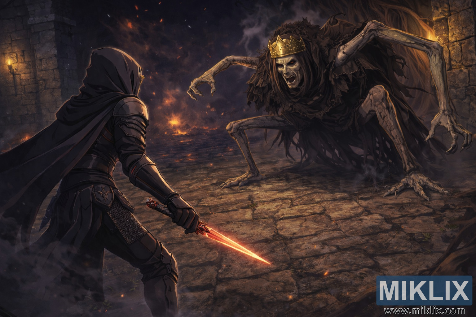 എൽഡൻ റിംഗിലെ അശുഭകരമായ കിംഗ്സ്റീം അവശിഷ്ടങ്ങളിൽ സജ്ജീകരിച്ചിരിക്കുന്ന ഉയർന്ന റെസല്യൂഷനുള്ള, ലാൻഡ്സ്കേപ്പ്-ഓറിയന്റഡ് ആനിമേഷൻ-സ്റ്റൈൽ ഫാൻ ആർട്ട് ചിത്രീകരണമാണിത്. പോരാട്ടം ആരംഭിക്കുന്നതിന് തൊട്ടുമുമ്പുള്ള നിശ്ചലതയുടെ നാടകീയ നിമിഷം ഇത് പകർത്തുന്നു, ചലനത്തേക്കാൾ സ്കെയിൽ, അന്തരീക്ഷം, മാനസിക പിരിമുറുക്കം എന്നിവയിൽ ശ്രദ്ധ കേന്ദ്രീകരിക്കുന്നു. കാലപ്പഴക്കം കൊണ്ട് വിണ്ടുകീറിയ പുരാതന കൽഭിത്തികളാൽ തകർന്ന മുറ്റം ചുറ്റപ്പെട്ടിരിക്കുന്നു, കട്ടിയുള്ളതും വളഞ്ഞതുമായ മരത്തിന്റെ വേരുകൾ ഭാഗികമായി നശിപ്പിക്കപ്പെടുന്നു. ചുവരുകളിൽ സ്ഥാപിച്ചിരിക്കുന്ന മിന്നുന്ന ടോർച്ചുകൾ ചൂടുള്ള ഓറഞ്ച് വെളിച്ചം പുറപ്പെടുവിക്കുന്നു, അത് ചുറ്റുമുള്ള ഇരുട്ടിലേക്ക് തുളച്ചുകയറുന്നില്ല, അതേസമയം തിളങ്ങുന്ന തീക്കനലുകളും ഒഴുകുന്ന പുകയും വായുവിൽ നിറയുന്നു, ഇത് ക്ഷയത്തിന്റെയും നീണ്ടുനിൽക്കുന്ന അപകടത്തിന്റെയും ഒരു തോന്നൽ സൃഷ്ടിക്കുന്നു.