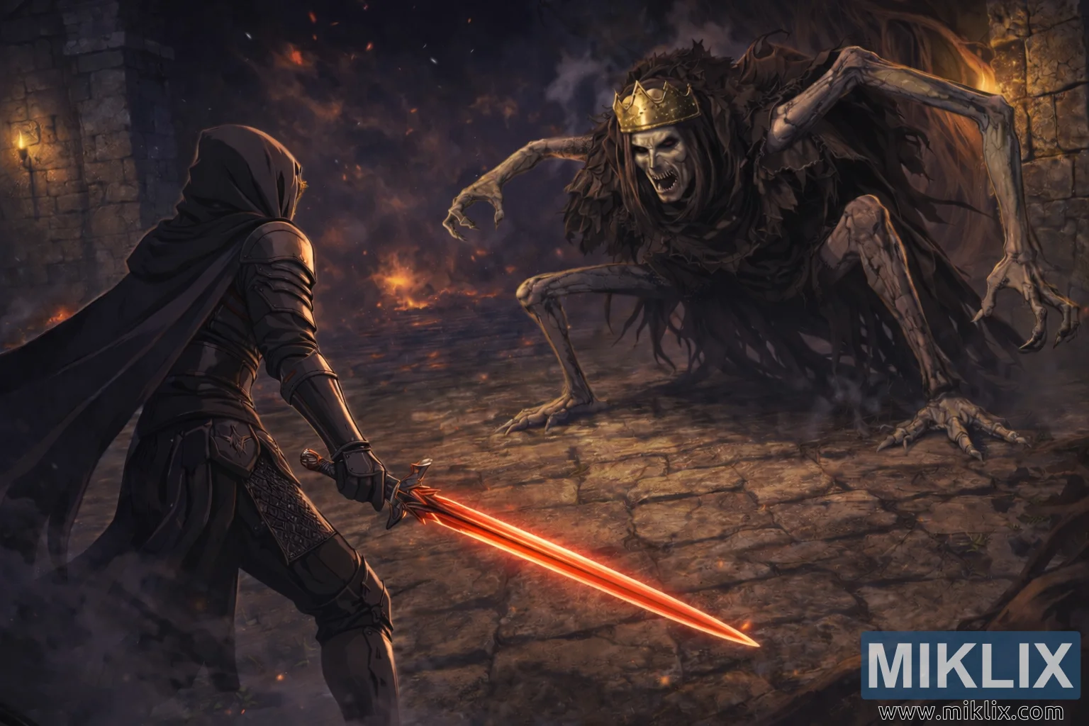 എൽഡൻ റിംഗിൽ നിന്ന് പ്രചോദനം ഉൾക്കൊണ്ട് ഉയർന്ന റെസല്യൂഷനുള്ള, ലാൻഡ്സ്കേപ്പ്-ഓറിയന്റഡ് ആനിമേഷൻ-സ്റ്റൈൽ ഫാൻ ആർട്ട് ചിത്രീകരണമാണ് ഈ ചിത്രം. ദുർഘടമായ കിംഗ്സ്റീം അവശിഷ്ടങ്ങൾക്കുള്ളിലാണ് ഇത് ഒരുക്കിയിരിക്കുന്നത്. യുദ്ധം ആരംഭിക്കുന്നതിന് തൊട്ടുമുമ്പ് തീവ്രമായ പ്രതീക്ഷയുടെ ഒരു നിമിഷത്തെ ഇത് ചിത്രീകരിക്കുന്നു, പ്രവർത്തനത്തേക്കാൾ അന്തരീക്ഷം, അളവ്, മാനസിക പിരിമുറുക്കം എന്നിവയ്ക്ക് പ്രാധാന്യം നൽകുന്നു. പുരാതനവും തകർന്നതുമായ മതിലുകളാൽ ചുറ്റപ്പെട്ട ഒരു നശിച്ച കൽമുറ്റമാണ് പരിസ്ഥിതി, അവയുടെ ഉപരിതലങ്ങൾ വിണ്ടുകീറി കട്ടിയുള്ളതും വളച്ചൊടിക്കുന്നതുമായ മരങ്ങളുടെ വേരുകൾ അവയെ മറികടക്കുന്നു. ചുവരിൽ ഘടിപ്പിച്ചിരിക്കുന്ന മിന്നുന്ന ടോർച്ചുകൾ ചുറ്റുമുള്ള ഇരുട്ടിനെതിരെ പോരാടുന്ന ചൂടുള്ളതും അസമവുമായ വെളിച്ചം പുറപ്പെടുവിക്കുന്നു, അതേസമയം തിളങ്ങുന്ന തീക്കനലുകൾ പുക നിറഞ്ഞ വായുവിലൂടെ ഒഴുകി നീങ്ങുന്നു, ഇത് അപകടത്തിന്റെയും ജീർണ്ണതയുടെയും ഒരു തോന്നൽ സൃഷ്ടിക്കുന്നു.
