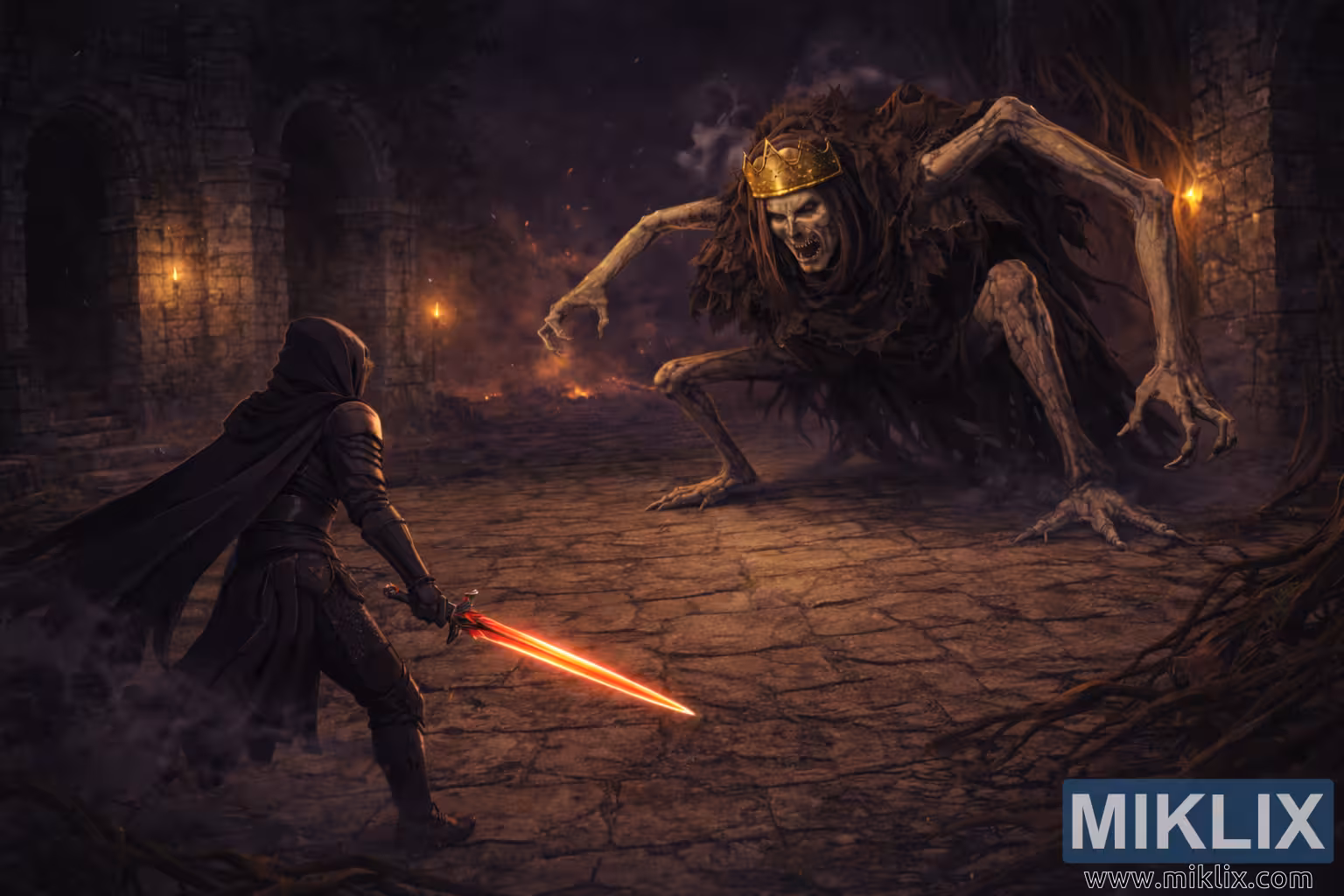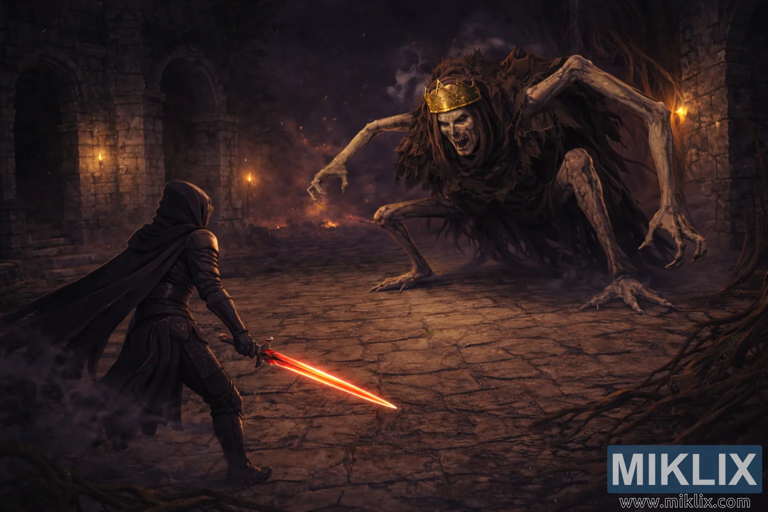 കല്ലിൽ പതിച്ചിരിക്കുന്ന സ്കോണുകളിൽ നിന്ന് ചൂടുള്ള ടോർച്ച് ലൈറ്റ് മിന്നിമറയുന്നു, മുറ്റത്ത് നീളമുള്ളതും അസമവുമായ നിഴലുകൾ വീശുന്നു. പശ്ചാത്തലത്തിൽ, ഒഴുകുന്ന പുകയും പൊങ്ങിക്കിടക്കുന്ന തീക്കനലുകളുംക്കിടയിൽ നേരിയ തീജ്വാലകൾ പുകയുന്നു, വായുവിൽ മൂടൽമഞ്ഞുള്ളതും അടിച്ചമർത്തുന്നതുമായ അന്തരീക്ഷം നിറയ്ക്കുന്നു. വികസിപ്പിച്ച പശ്ചാത്തലം കമാനാകൃതിയിലുള്ള ഇടവേളകൾ, പരുക്കൻ കൊത്തുപണികൾ, തീജ്വാലകളുടെ അപ്രാപ്യമായ ഇരുട്ട് എന്നിവ വെളിപ്പെടുത്തുന്നു, ഇത് രംഗത്തിന് ആഴത്തിന്റെയും ഒറ്റപ്പെടലിന്റെയും ഒരു തോന്നൽ നൽകുന്നു. രണ്ട് രൂപങ്ങൾക്കിടയിൽ വിണ്ടുകീറിയ ഉരുളൻ കല്ല് തറ നീണ്ടുകിടക്കുന്നു, അതിന്റെ അസമമായ ഉപരിതലം അവശിഷ്ടങ്ങളും വേരുകളും കൊണ്ട് നിറഞ്ഞിരിക്കുന്നു, കാഴ്ചക്കാരന്റെ കണ്ണിനെ നേരിട്ട് ഏറ്റുമുട്ടലിലേക്ക് നയിക്കുന്നു.
