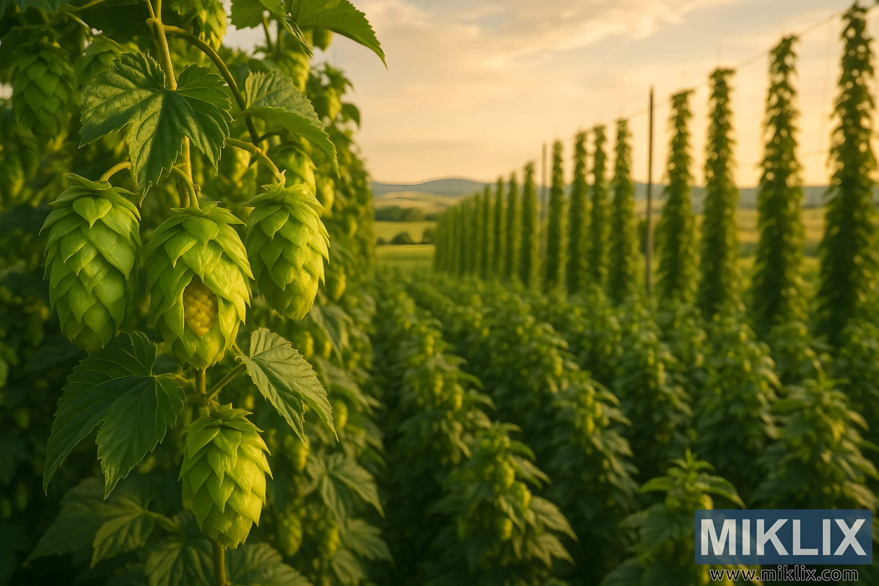 സൂര്യാസ്തമയ സമയത്ത് പച്ചപ്പു നിറഞ്ഞ ഒരു ബുള്ളിയൻ ഹോപ്പ് പാടത്തിന്റെ ഉയർന്ന റെസല്യൂഷൻ ചിത്രം, അതിൽ പഴുത്ത പച്ച കോണുകളും, ഉയരമുള്ള ട്രെല്ലിസുകളും, സ്വർണ്ണ വെളിച്ചത്തിൽ ഉരുണ്ടുകൂടുന്ന ഗ്രാമപ്രദേശങ്ങളും പ്രദർശിപ്പിച്ചിരിക്കുന്നു - മികച്ച ഏൽസ് ഉണ്ടാക്കുന്നതിൽ പ്രകൃതിയുടെ പങ്കിനുള്ള ഉജ്ജ്വലമായ ആദരാഞ്ജലി.