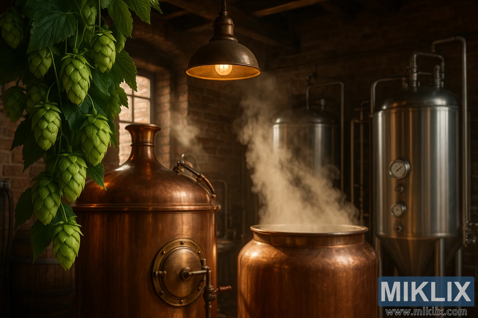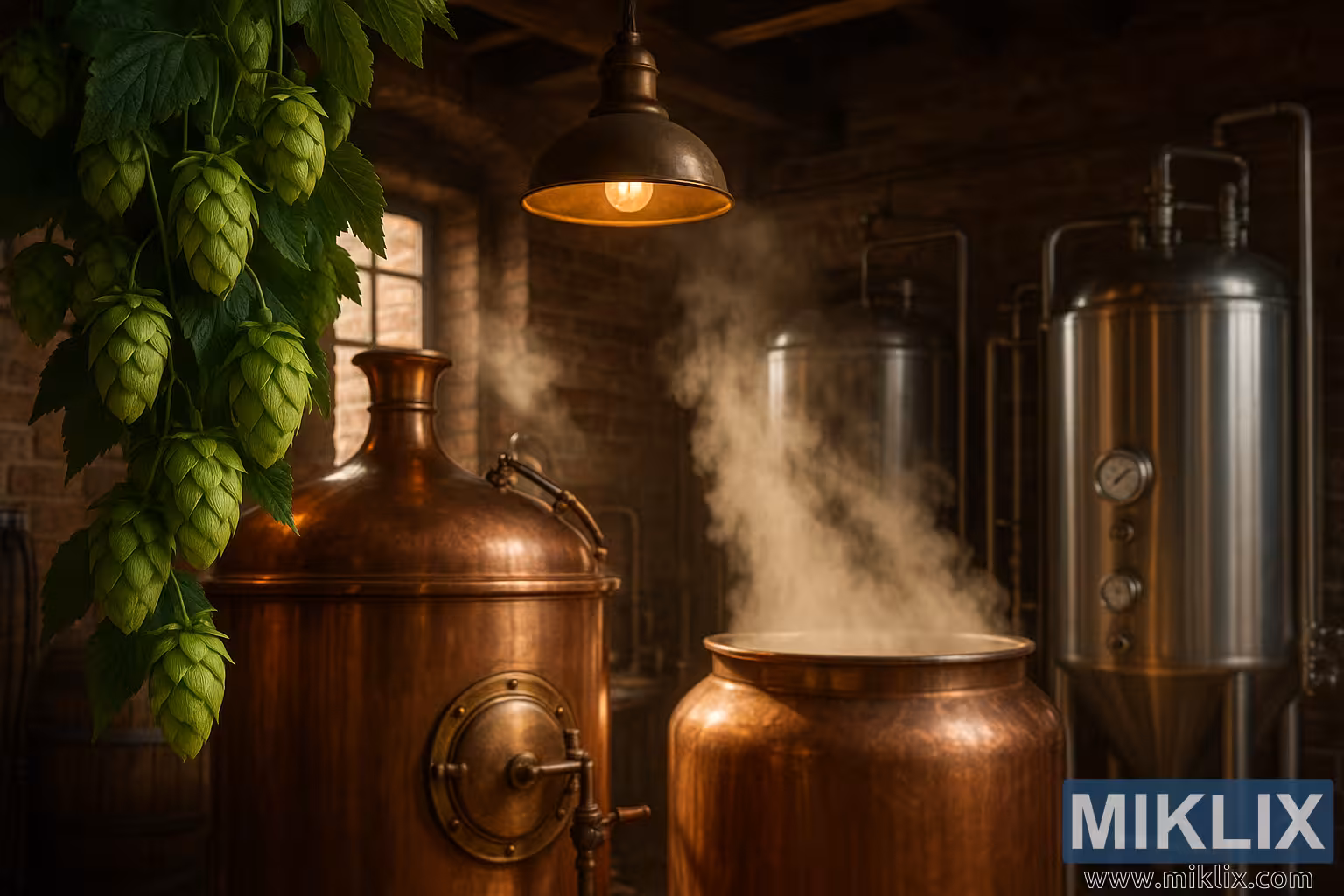 ഈ ഊഷ്മളവും ആകർഷകവുമായ ഇടത്തിന്റെ മധ്യത്തിൽ ചെമ്പ് ബ്രൂ കെറ്റിലുകൾ നിൽക്കുന്നു - തിളങ്ങുന്ന, കാലഹരണപ്പെട്ട പാത്രങ്ങൾ, എണ്ണമറ്റ ബാച്ചുകൾ അവയുടെ അറകളിലൂടെ കടന്നുപോയിട്ടുണ്ട്. ഒരു കെറ്റിൽ സ്ഥിരമായി നീരാവി പുറപ്പെടുവിക്കുന്നു, മാഷ് ട്യൂണിൽ ധാന്യങ്ങൾ കുതിർന്ന്, പഞ്ചസാരയും സുഗന്ധങ്ങളും പുറത്തുവിടുന്നു, അത് ബ്രൂവിന്റെ നട്ടെല്ലായി മാറുന്നു. മുകളിൽ തൂക്കിയിട്ടിരിക്കുന്ന ഒരു വ്യാവസായിക പെൻഡന്റ് വിളക്കിന്റെ വെളിച്ചത്തിൽ ചെമ്പ് തിളങ്ങുന്നു, അതിന്റെ സ്വർണ്ണ നിറം രംഗത്തിന് ഒരു ഗൃഹാതുരത്വത്തിന്റെ ആകർഷണം നൽകുന്നു. വിളക്ക് തന്നെ മറ്റൊരു യുഗത്തിന്റെ അവശിഷ്ടമാണ്, അതിന്റെ രൂപകൽപ്പന മുറിയിൽ വ്യാപിച്ചുകിടക്കുന്ന പഴയ ലോക സംവേദനക്ഷമതകളെ പ്രതിധ്വനിപ്പിക്കുന്നു. ഉപരിതലങ്ങളിൽ നൃത്തം ചെയ്യുന്ന മൃദുവായ, ആംബർ വെളിച്ചം ഇത് വീശുന്നു, ലോഹം, മരം, ഇഷ്ടിക എന്നിവയുടെ പരസ്പരബന്ധം ടെക്സ്ചറുകളുടെ ഒരു സിംഫണിയിൽ എടുത്തുകാണിക്കുന്നു.