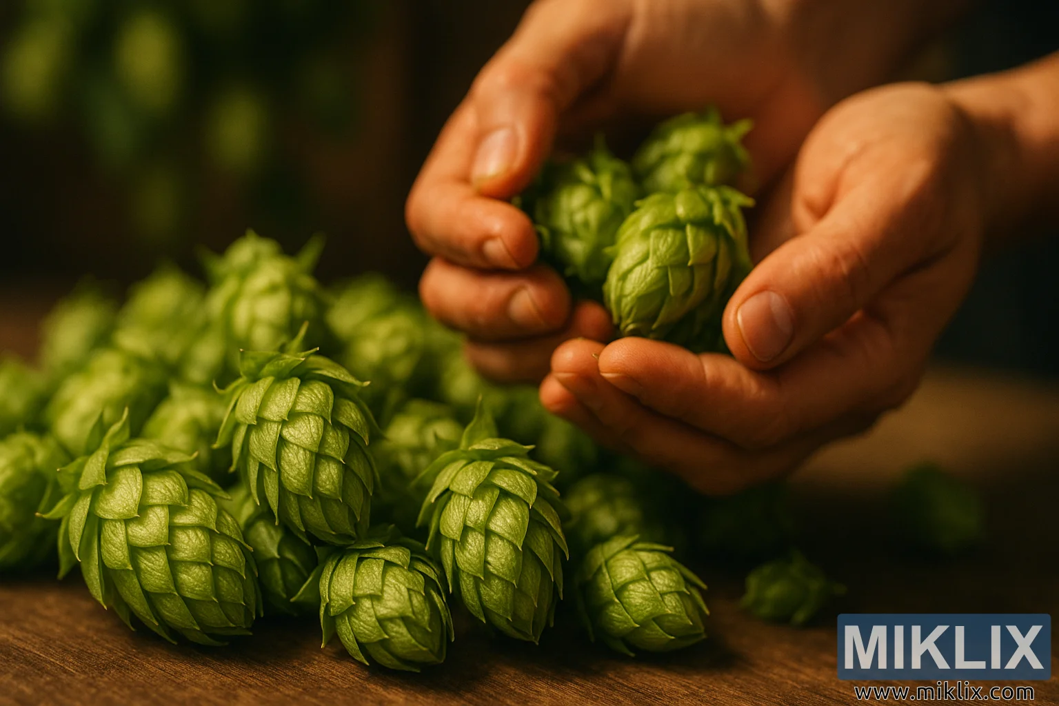 പശ്ചാത്തലം മൃദുവായ ഫോക്കസിലാണ്, കാഴ്ചക്കാരന്റെ ശ്രദ്ധ ഹോപ്സിലേക്കും അവയെ പിടിച്ചിരിക്കുന്ന കൈകളിലേക്കും ആകർഷിക്കുന്നതിനായി മനഃപൂർവ്വം മങ്ങിച്ചിരിക്കുന്നു. ഈ ആഴത്തിലുള്ള ഫീൽഡ് ഉപയോഗം ഒരു അടുപ്പബോധം സൃഷ്ടിക്കുന്നു, ശ്രദ്ധയുടെ വ്യാപ്തി ചുരുക്കുന്നു, അങ്ങനെ ഹോപ് കോണുകളുടെ ഓരോ വരമ്പും, സ്കെയിലും, മടക്കുകളും അതിന്റെ വിശദാംശങ്ങളിൽ വിലമതിക്കാൻ കഴിയും. ഇത് ദൃശ്യത്തിന്റെ ഇന്ദ്രിയ ധാരണ വർദ്ധിപ്പിക്കുന്നു, ഭാവനയ്ക്ക് കാണാനോ മണക്കാനോ കഴിയാത്തതിൽ നിറയ്ക്കാൻ അനുവദിക്കുന്നു: പുതുതായി പറിച്ചെടുത്ത ഹോപ്സിന്റെ മണ്ണിന്റെ മധുരം, വിളവെടുപ്പ് കളപ്പുരയിലെ പ്രവർത്തനത്തിന്റെ നേരിയ മൂളൽ, അവ ഒടുവിൽ ബിയറായി മാറുമെന്ന പ്രതീക്ഷ. ഹോപ്സിനെ അസംസ്കൃത വസ്തുക്കളായി മാത്രമല്ല, നൂറ്റാണ്ടുകൾ പഴക്കമുള്ള ഒരു മദ്യനിർമ്മാണ പാരമ്പര്യത്തിന്റെ മൂലക്കല്ലായി അംഗീകരിക്കുന്നതുപോലെ, മാനസികാവസ്ഥ ശാന്തവും ആദരവുള്ളതുമാണ്.