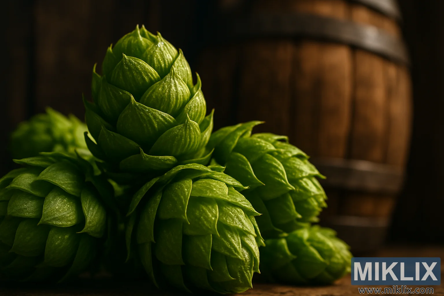 ആഴം കുറഞ്ഞതാണ്, കാഴ്ചക്കാരന്റെ നോട്ടം കോണുകളിൽ തന്നെ മൂർച്ച കൂട്ടുന്നു, അതേസമയം ബാരലിനെ ഘടനയുടെയും നിർദ്ദേശത്തിന്റെയും പശ്ചാത്തലത്തിലേക്ക് മൃദുവായി ലയിപ്പിക്കുന്നു. ഇത് ഒരു അടുപ്പബോധം സൃഷ്ടിക്കുന്നു, ഫോട്ടോ കാഴ്ചക്കാരനെ ചാരി നിന്ന് ഹോപ്സിനെ അടുത്ത് പരിശോധിക്കാനും, അവയുടെ കടലാസ് പോലുള്ള വികാരവും കൊഴുത്ത പശയും സങ്കൽപ്പിക്കാനും, ഒന്ന് സൌമ്യമായി ചതച്ച്, മൊസൈക് ഹോപ്സിന് പേരുകേട്ട സിട്രസ്, പൈൻ, സ്റ്റോൺ ഫ്രൂട്ട്, ഉഷ്ണമേഖലാ കുറിപ്പുകൾ എന്നിവയുടെ സുഗന്ധമുള്ള പൊട്ടിത്തെറി പുറപ്പെടുവിക്കാനും ക്ഷണിക്കുന്നു. ആ നിമിഷം, കാഴ്ചയ്ക്കും സുഗന്ധത്തിനും ഇടയിലുള്ള വിടവ് ചുരുങ്ങുന്നതായി തോന്നുന്നു, ചിത്രം ഏതാണ്ട് ഒരു ഘ്രാണ അനുഭവമായി മാറുന്നു.