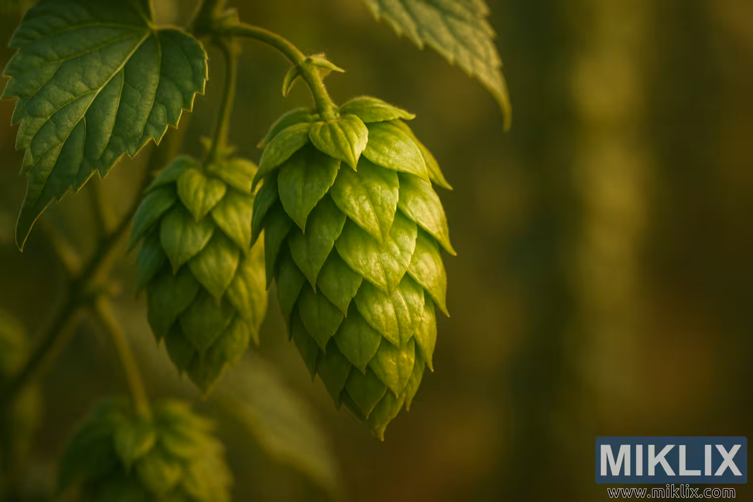 ഇരട്ട ഉദ്ദേശ്യമുള്ള ഹോപ്പ് കോണുകളുടെ ഒരു അടുത്ത ഫോട്ടോ, അവയുടെ സങ്കീർണ്ണമായ പച്ച നിറത്തിലുള്ള സഹപത്രങ്ങൾ സ്വർണ്ണ വെളിച്ചത്തിൽ തിളങ്ങുന്നു, മുന്തിരിവള്ളികളും ഇലകളും മൃദുവായി ഫോക്കസ് ചെയ്ത പശ്ചാത്തലത്തിൽ ഫ്രെയിം ചെയ്തിരിക്കുന്നു.