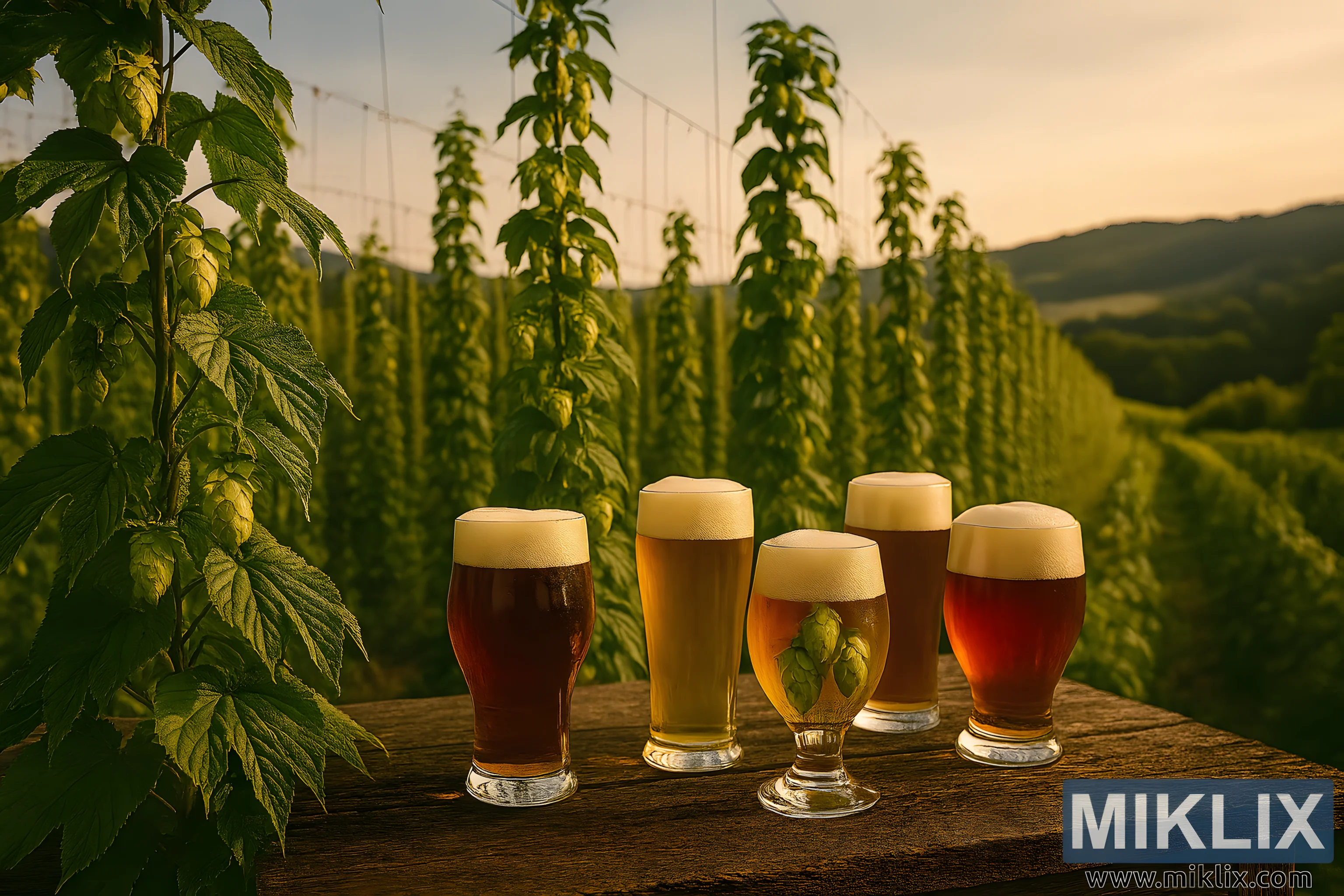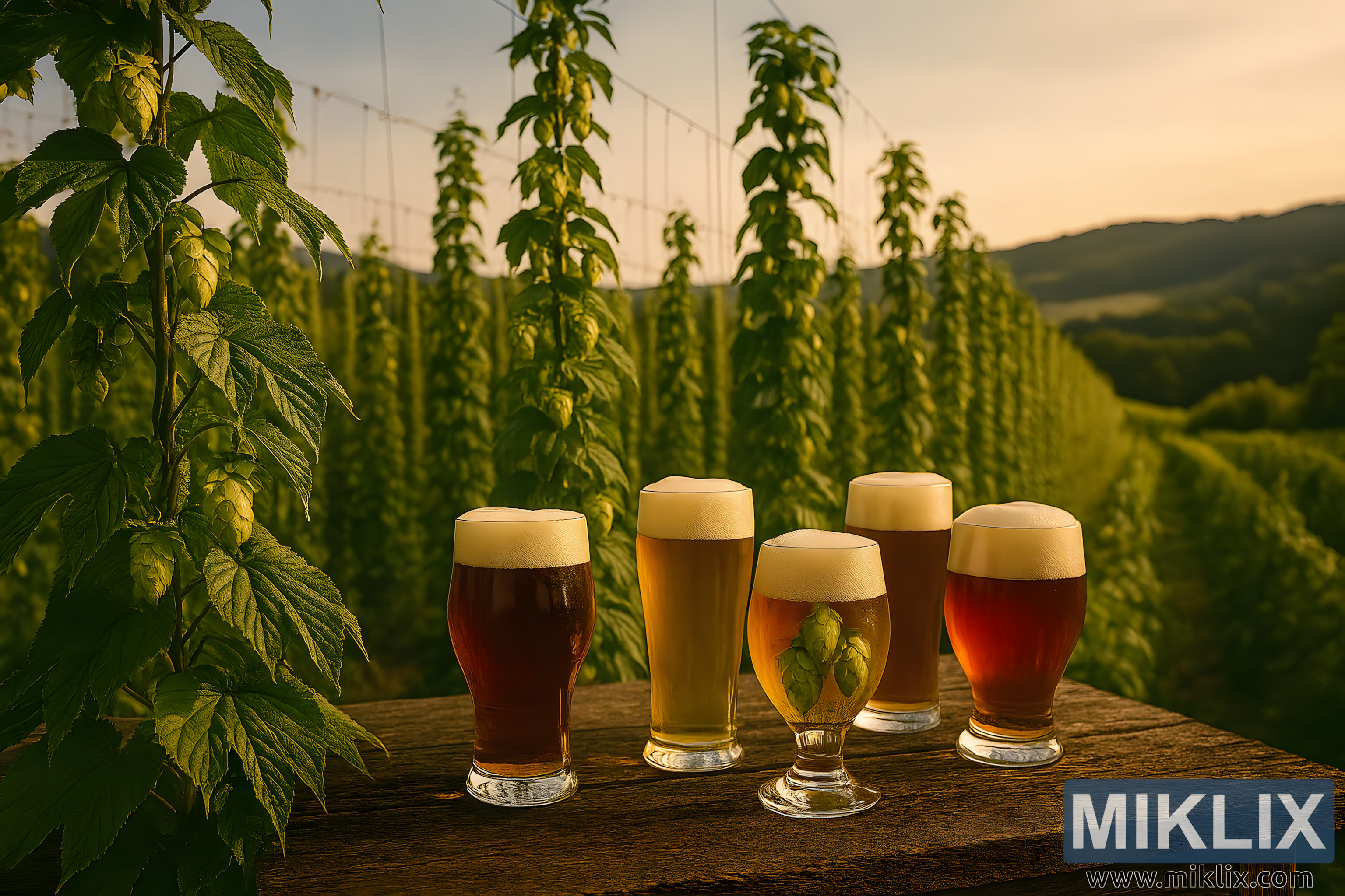 ഈ ഉയർന്ന റെസല്യൂഷനുള്ള ലാൻഡ്സ്കേപ്പ് ചിത്രം, സുവർണ്ണ മണിക്കൂറിന്റെ ഊഷ്മളമായ തിളക്കത്തിൽ മുങ്ങിക്കുളിച്ച ഒരു പ്രീമിയന്റ് ഹോപ്പ് ഫീൽഡിന്റെ ശാന്തമായ സമൃദ്ധി പകർത്തുന്നു. കോമ്പോസിഷൻ ആരംഭിക്കുന്നത് സമ്പന്നമായ വിശദമായ മുൻഭാഗത്തോടെയാണ്: ഉയരമുള്ള, പച്ചപ്പു നിറഞ്ഞ ഹോപ്പ് ബൈനുകൾ ദൃഢമായ ട്രെല്ലിസുകളിൽ കയറുന്നു, അവയുടെ ഹൃദയാകൃതിയിലുള്ള, ദന്തങ്ങളോടുകൂടിയ ഇലകൾ ഇളം കാറ്റിൽ സൌമ്യമായി ആടുന്നു. ബൈനുകൾ കട്ടിയുള്ളതും ആരോഗ്യകരവുമാണ്, സസ്യശക്തിയോടെ മുകളിലേക്ക് വളയുന്നു, ഇറുകിയ വയറുകളും വയലിലുടനീളം സമാന്തര നിരകളായി നീണ്ടുനിൽക്കുന്ന മരത്തടികളും പിന്തുണയ്ക്കുന്നു.